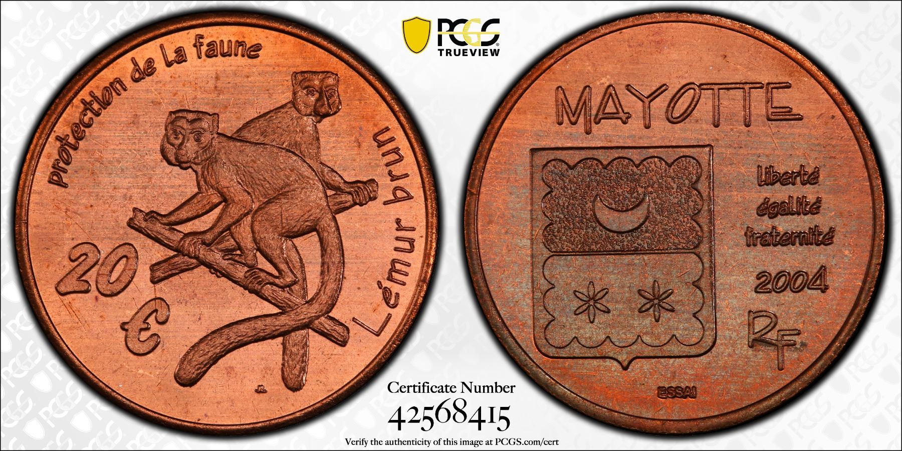 MAYOTTE: Fantasy Issues, AE 20 euro, 2004, KM-XE15a, Wildlife Conservation Series - Common Brown Lemur, fantasy pattern essai in pure copper, mintage of only 30 pieces, very rare, PCGS graded MS66 RD. Private pattern struck at the Patrick Mint. The mint began operating in 1972 and was known for striking mainly tokens until the mint was destroyed in the 2017 Tubbs Fire in the "Northern California Firestorm" along with 5,642 other structures in Santa Rosa, California.