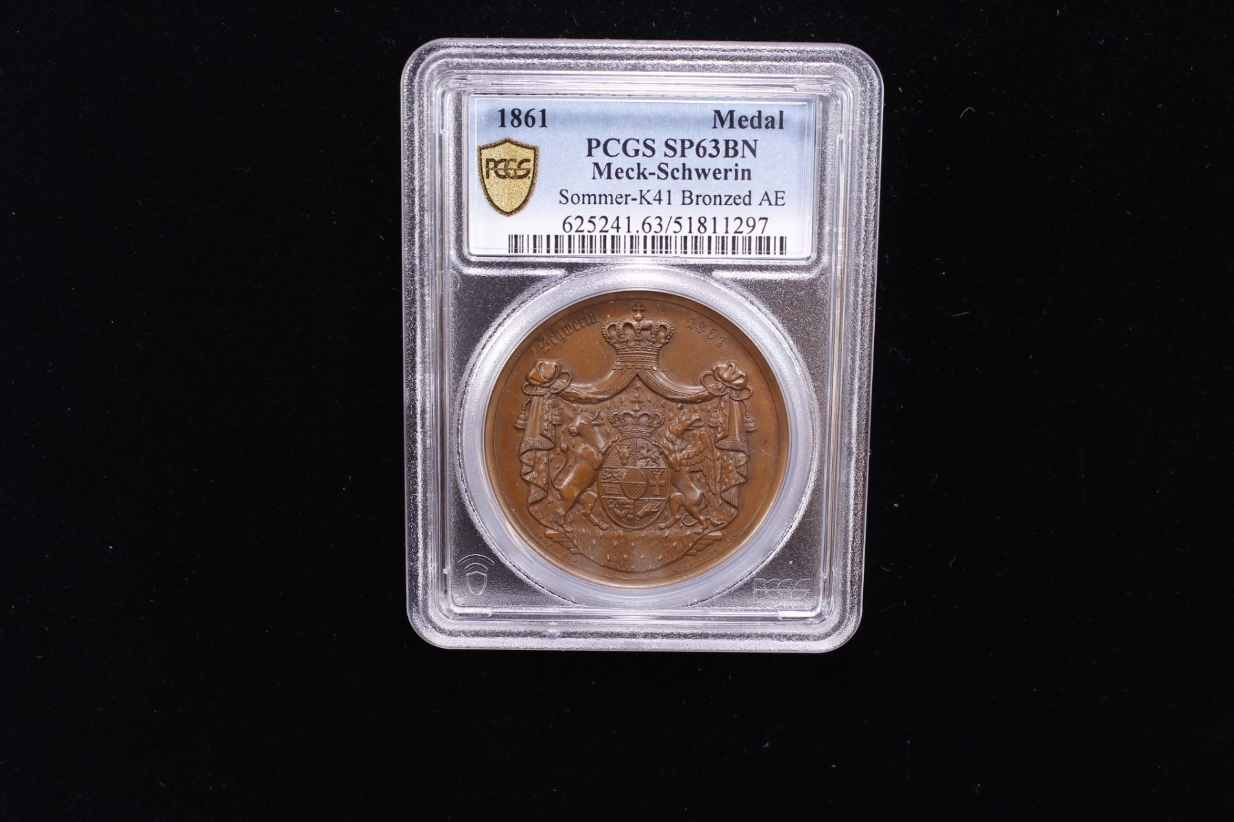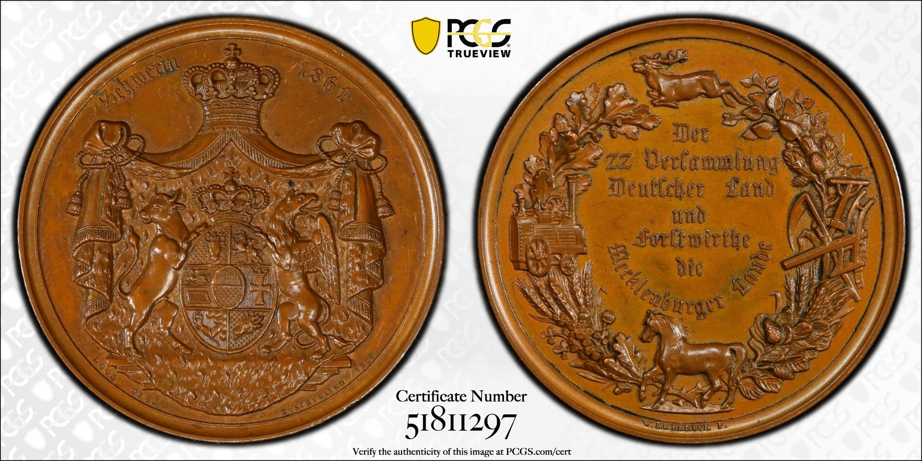 MECKLENBURG-SCHWERIN: AE medal, 1861, Sommer-K41, Gaettens-1694, 42mm bronze medal by E. Schilling & Loos for the 22nd Assembly of German Farmers and Forester; SCHWERIN 1861 above arms of the Grand Duchy // Fraktur script inscription in seven lines, a lovely specimen quality example! PCGS graded Specimen 63.
