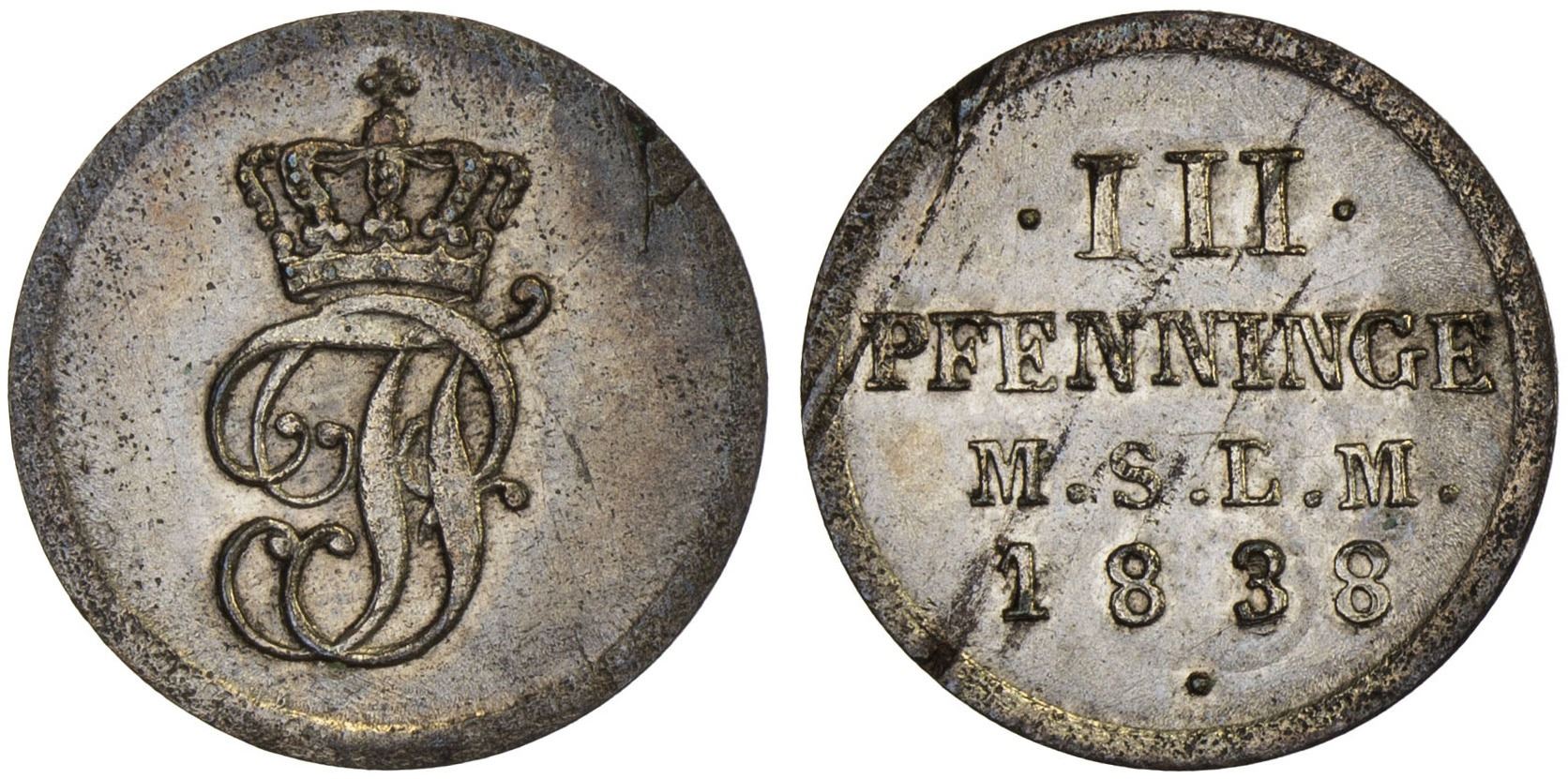 MECKLENBURG-SCHWERIN: Paul Friedrich, 1837-1842, AR 3 pfennig, 1838, choice AU