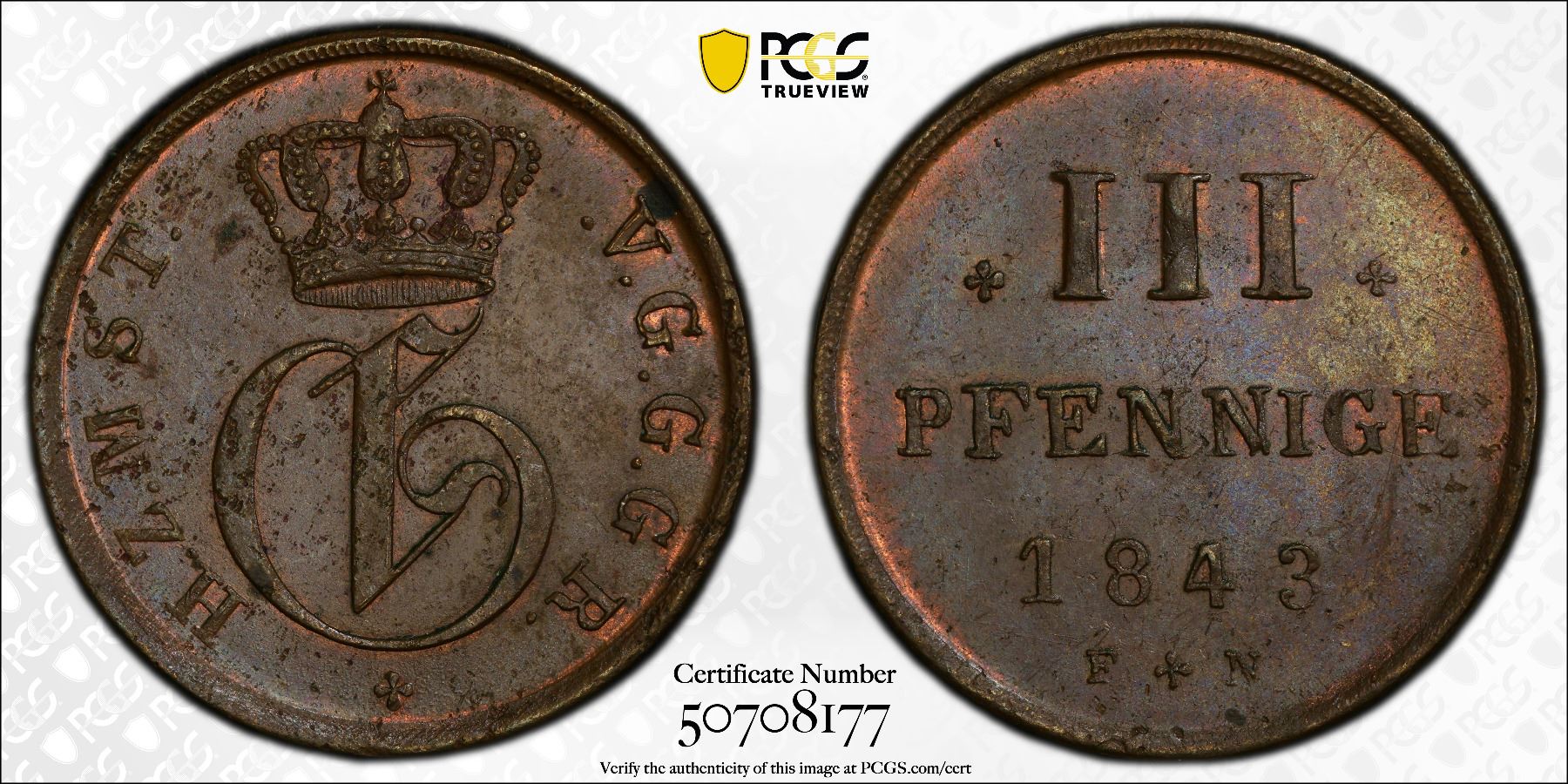 MECKLENBURG-STRELITZ: Georg, 1816-1860, AE 3 pfennig, 1843, PCGS MS63 BN