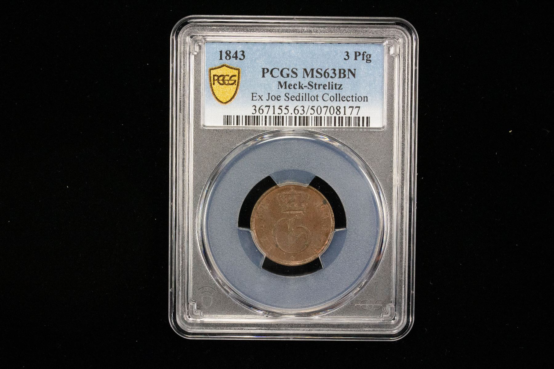 MECKLENBURG-STRELITZ: Georg, 1816-1860, AE 3 pfennig, 1843, KM-80, Cr-2, a lovely mint state example! PCGS graded MS63 BN, ex Joe Sedillot Collection.