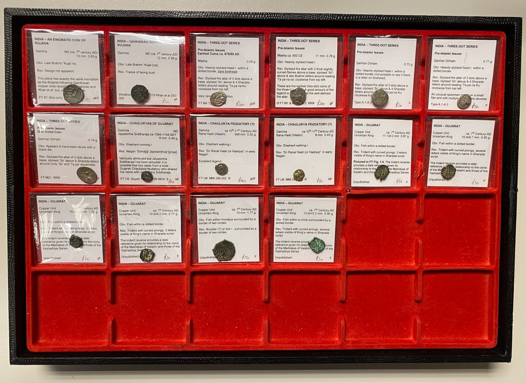 MEDIEVAL HINDU INDIA: LOT of 8 silver dammas & 9 small copper coins, Silver: Chalukyas of Gujarat (3): two of Rana Hasti and one of Siddharaja, elephant obverse, 11th/12th century; and Amirs of Multan: (5): in the name of a theortical "ruler" Tapanaku; and Copper: Gujarat Region (6) unknown ruler, very crude small coins, each less than 1g weight; and Kujana: (2) uncertain anonymous coins, probably billon rather than copper; each with Todd's full description; retail value $400, lot of 17 pieces, ex Ian Todd Collection.