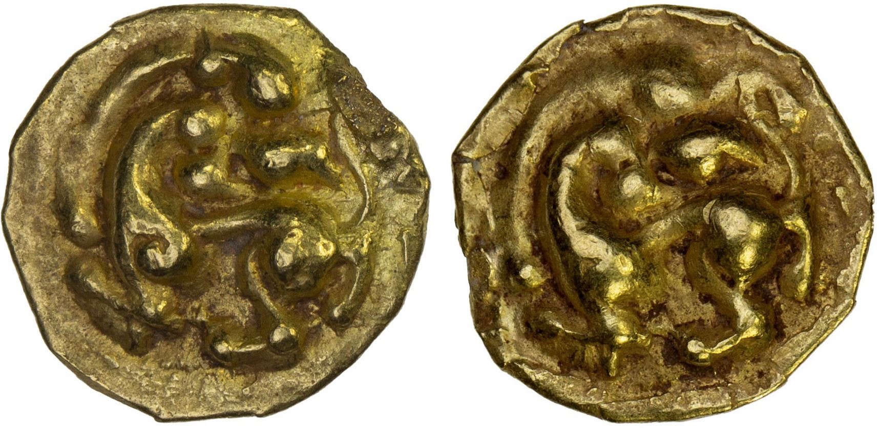 MEDIEVAL HINDU INDIA: Unknown issuer, ca. 12th/15th century, AV heavy fanam (0.51g), VF-XF