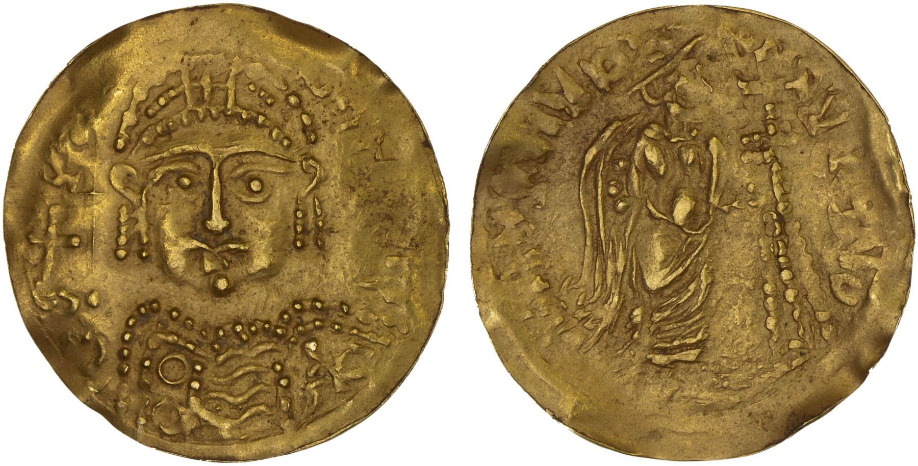 MEDIEVAL ISLAMIC: Anonymous, ca. 8th-12th century, AV burial token (0.89g), A-3850, imitating a late 7th century Byzantine solidus with a reverse that seems to be based on a much later solidus or fraction, VF-XF.