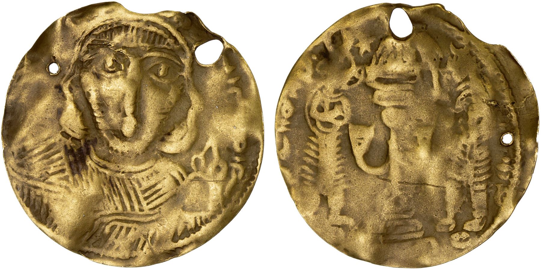 MEDIEVAL ISLAMIC: Anonymous, ca. 8th-12th century, AV burial token (1.54g), A-3850, imitating an early Byzantine obverse with a later Sasanian reverse! pierced twice for suspension, VF.