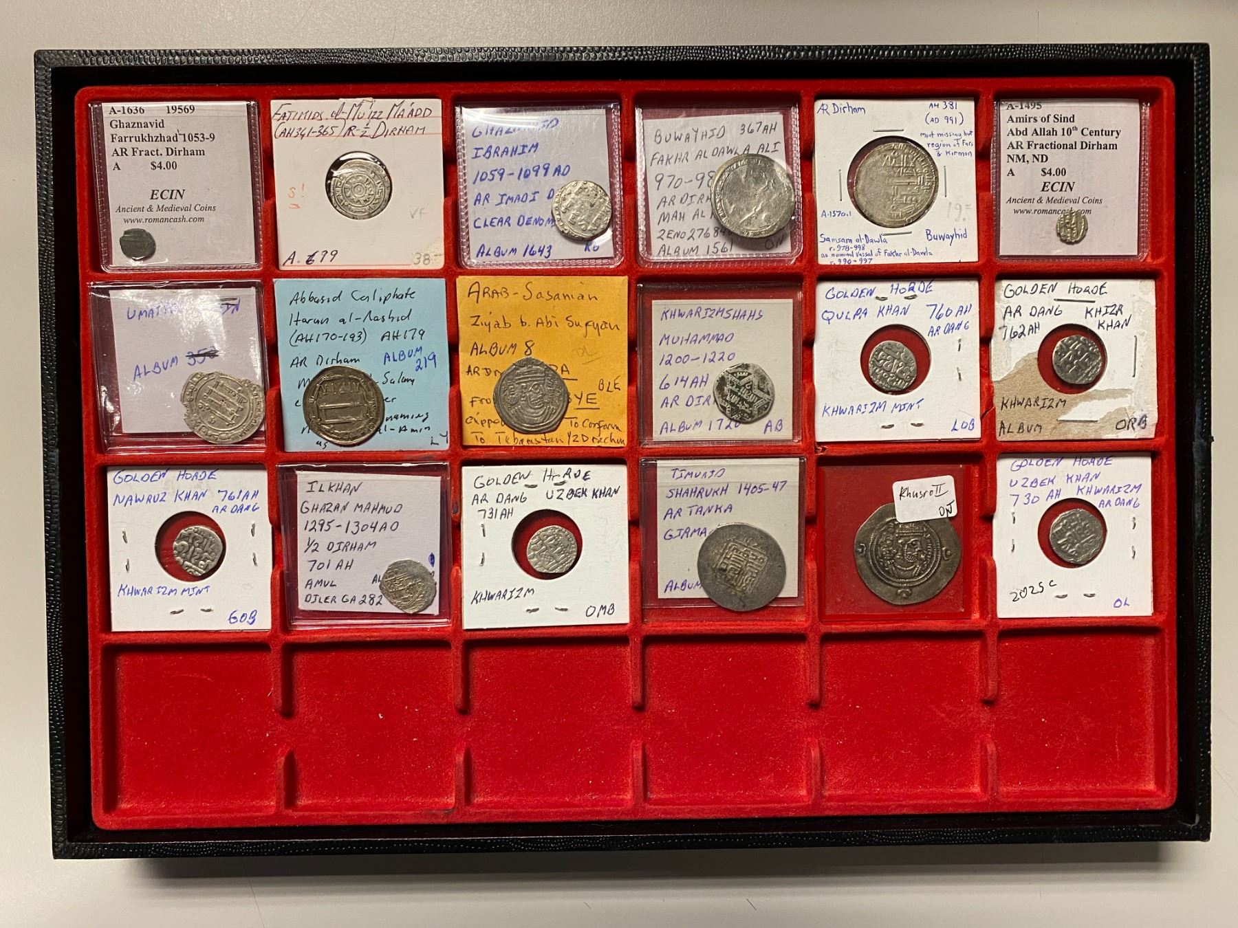 MEDIEVAL ISLAMIC: LOT of 18 silver coins, including Arab-Sasanian (1 pc), Abbasid (1), Umayyad of Spain (1), Fatimid (1), Habbarid (1), Buwayhid (2), Ghaznavid (2), Khwarizmshah (1), Golden Horde (5, including nice VF example of Khwarizm AH730), Ilkhan (1), and Timurid (1), plus pre-Islamic ordinary Sasanian, Khusro II (1); average circulated grades; all with the consignor's attribution (not confirmed); retail value $400, lot of 18 pieces.