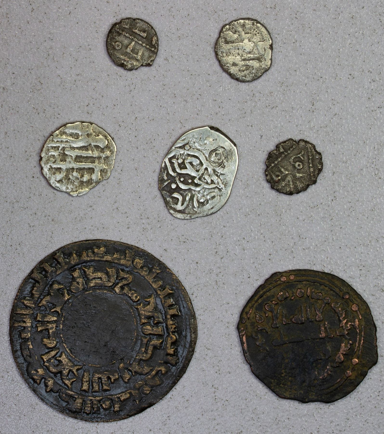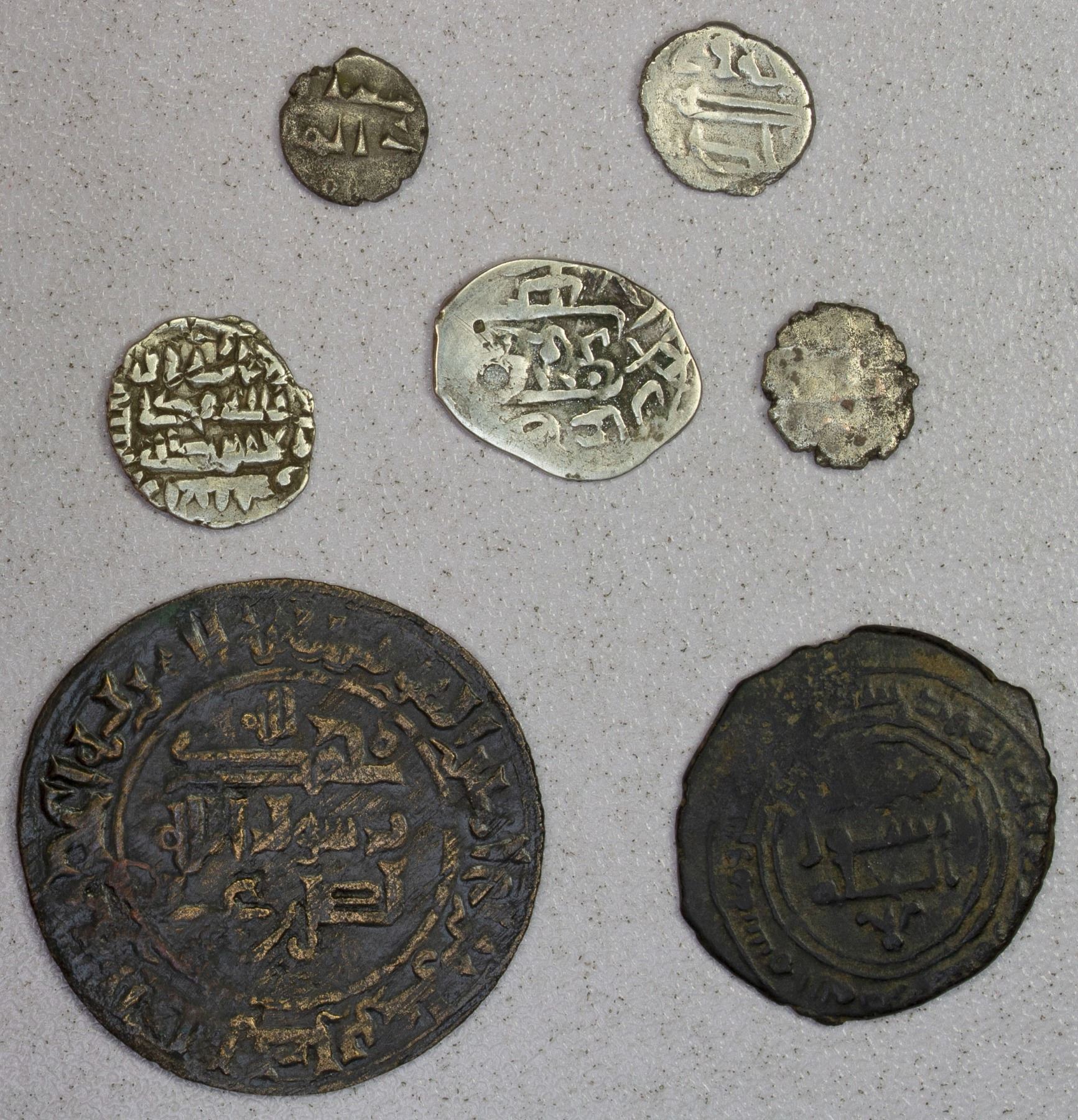 MEDIEVAL ISLAMIC: LOT of 2 copper & 5 tiny silver coins, Copper: Abbasid (1 pc, type of Samarqand AH153 citing Humayd b. Qahtaba, partly weak, Fine) and Qarakhanid (1, Ferghana AH398, as Zeno-112013, VF); and Silver: Habbarid (4, one of Umar I dated AH24x, F-VF, one of Yahya, Good, and two of the "al-Mustansir" triangular type, FT-LH6, both crude VF); and Shirvanshah (1, uncertain type of the early 10th century Hijri, crude Fine); retail value $280, lot of 7 pieces.