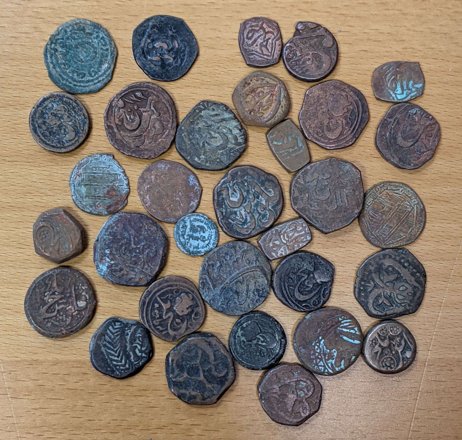 MEDIEVAL ISLAMIC:LOT of 32 copper coins of the mint of Balkh, mostly civic fulus (Durrani, Barakzay, and some earlier), plus a couple Umayyad & Abbasid; average Fine condition; including a few better types; retail value $700, unidentified and loose in a box; lot of 32 pieces.