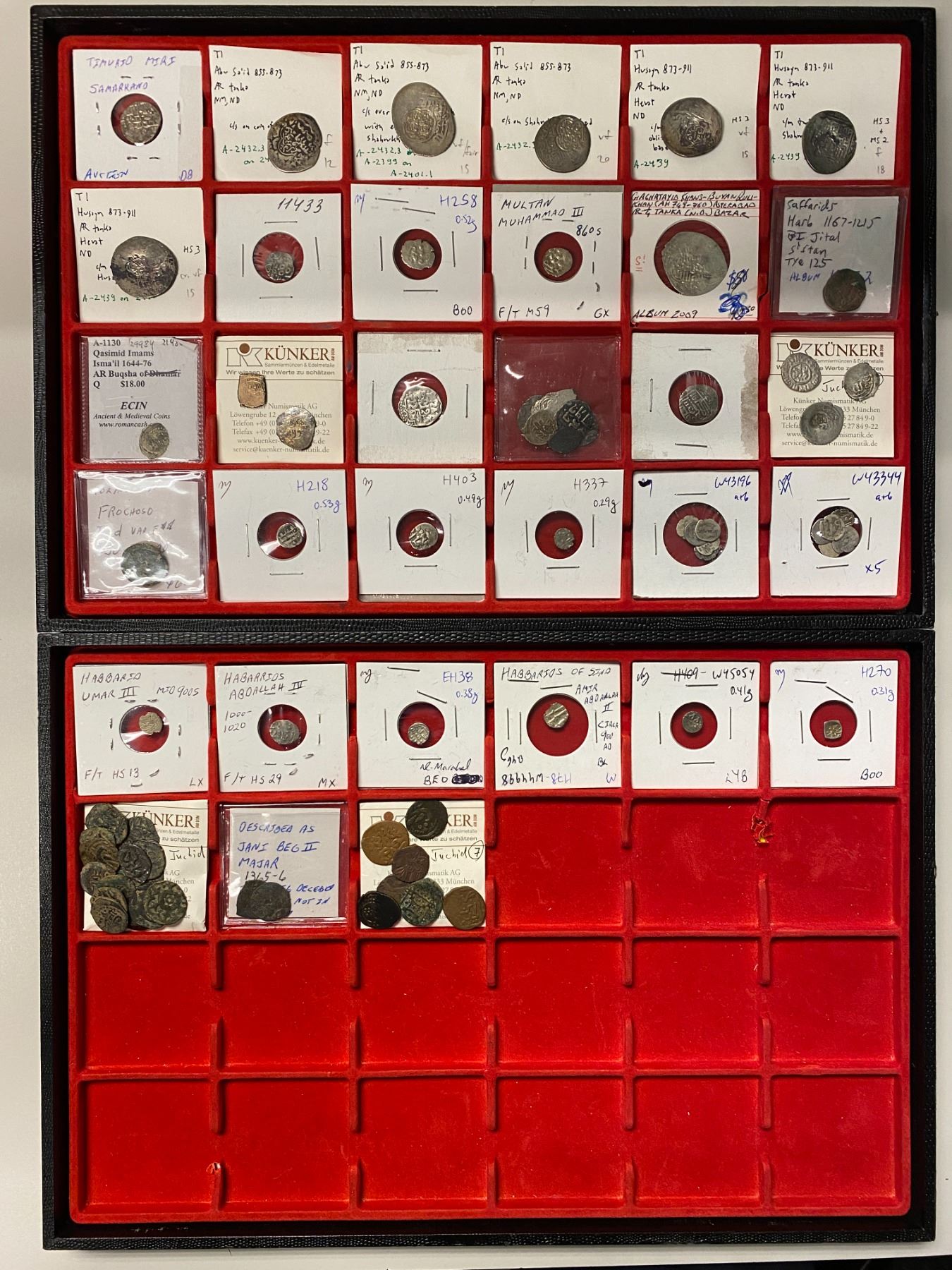 MEDIEVAL ISLAMIC: LOT of 43 silver & 25 copper coins, Silver: Habbarid (15 pcs, all tiny dammas, poor quality), Amirs of Mulan (2), Golden Horde (12, mostly poor quality), Saffarid (1), Chaghatayid (1), Qasimid (1), and uncertain (3); and Copper: Golden Horde (24, mostly Good to VG), and Spanish Umayyad (1); nearly all in lower quality circulating grades. some with the consignor's attribution; viewing recommended; retail value $500 lot of 68 piece.
