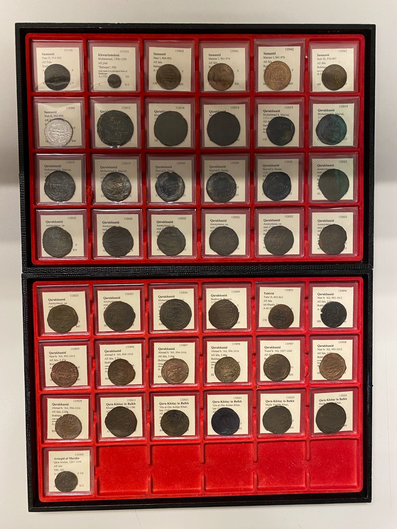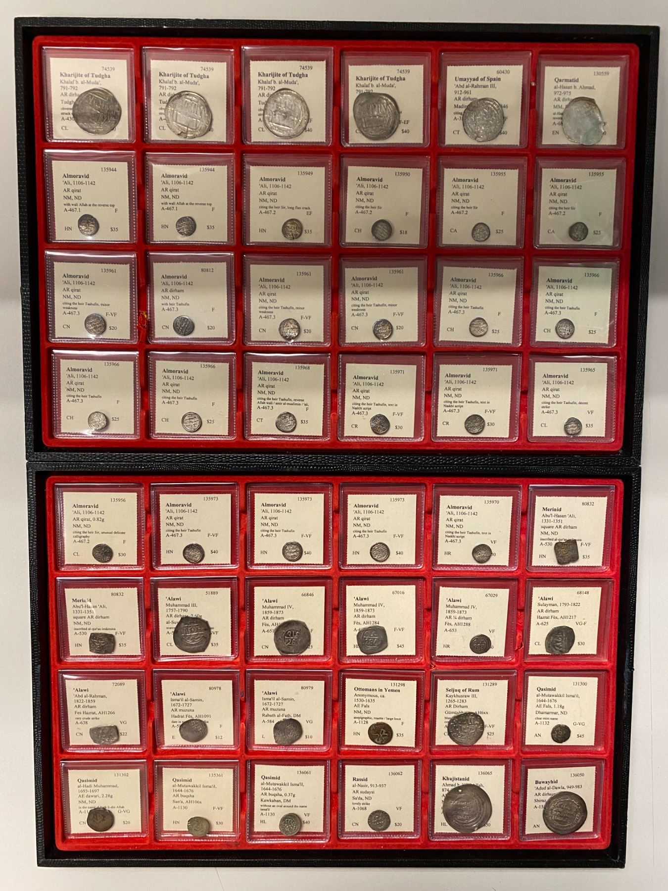 MEDIEVAL ISLAMIC: LOT of 91 coins, including silver and bronze coins from the following Pre-Mongol Era dynasties; Kharijite of Tudgha, Umayyad of Spain, Almoravid, Merinid, 'Alawi Sharifs, Ottomans in Yemen, Seljuq of Rum, Qasimid, Rassid, Khujistanid, Buwayhid, Samanid, Khwarizmshahs, Qarakhanid, Tahirid, Qara-Khitay in Balkh, Artuqid of Mardin, all from our old stock and attributed in 2x2 holders, average to better quality examples, retail value $3400, lot of 91 coins.