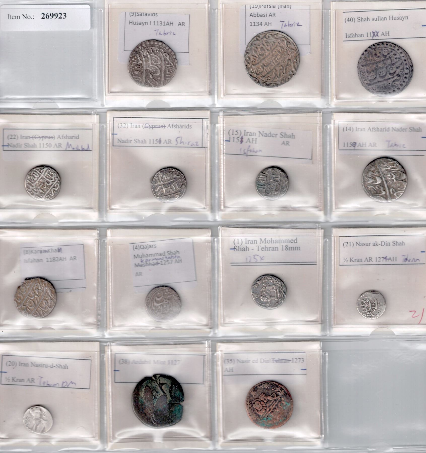 MEDIEVAL ISLAMIC:LOT of 12 silver and 2 copper hammered coins: Safavid: Sultan Husayn abbasi Tabriz 1131 & 1134, Isfahan DM; Afsharid: Nadir Shah 6 shahi Mashhad 1150, Shiraz 1151, Isfahan 1151, rupi Tabriz 1159; Zand: Karim Khan Isfahan 8 shahi 1182; Qajar: Muhammad Shah qiran Kermanshahan 1257, Tehran 125X Lion & Sun, Nasir al-Din Shah ½ qiran Tehran 1274 & DM; Civic copper: Ardabil 1127, 'Iran' 1273; average circulated conditions, retail value $350; lot of 14 pieces.