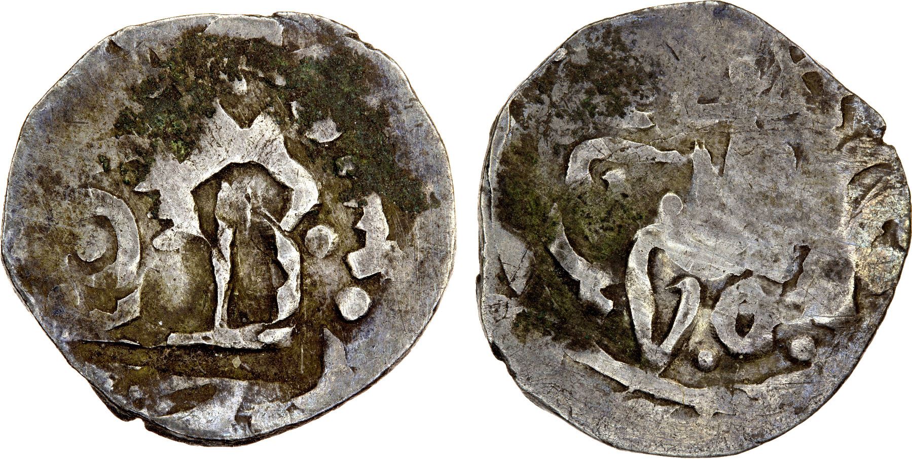 MEDIEVAL RUSSIA: PRINCIPALITY OF KIEV: Vytautas (Vitovt), 1392-1430, AR denga (0.81g), HP-2625A, columns of Giedimin counterstamped on a Golden Horde dirham, ca. 1419-1424, without pellets, host is issue of Chekra Khan (fl. 1414-1416), VF, R7, ex Jim Farr Collection.