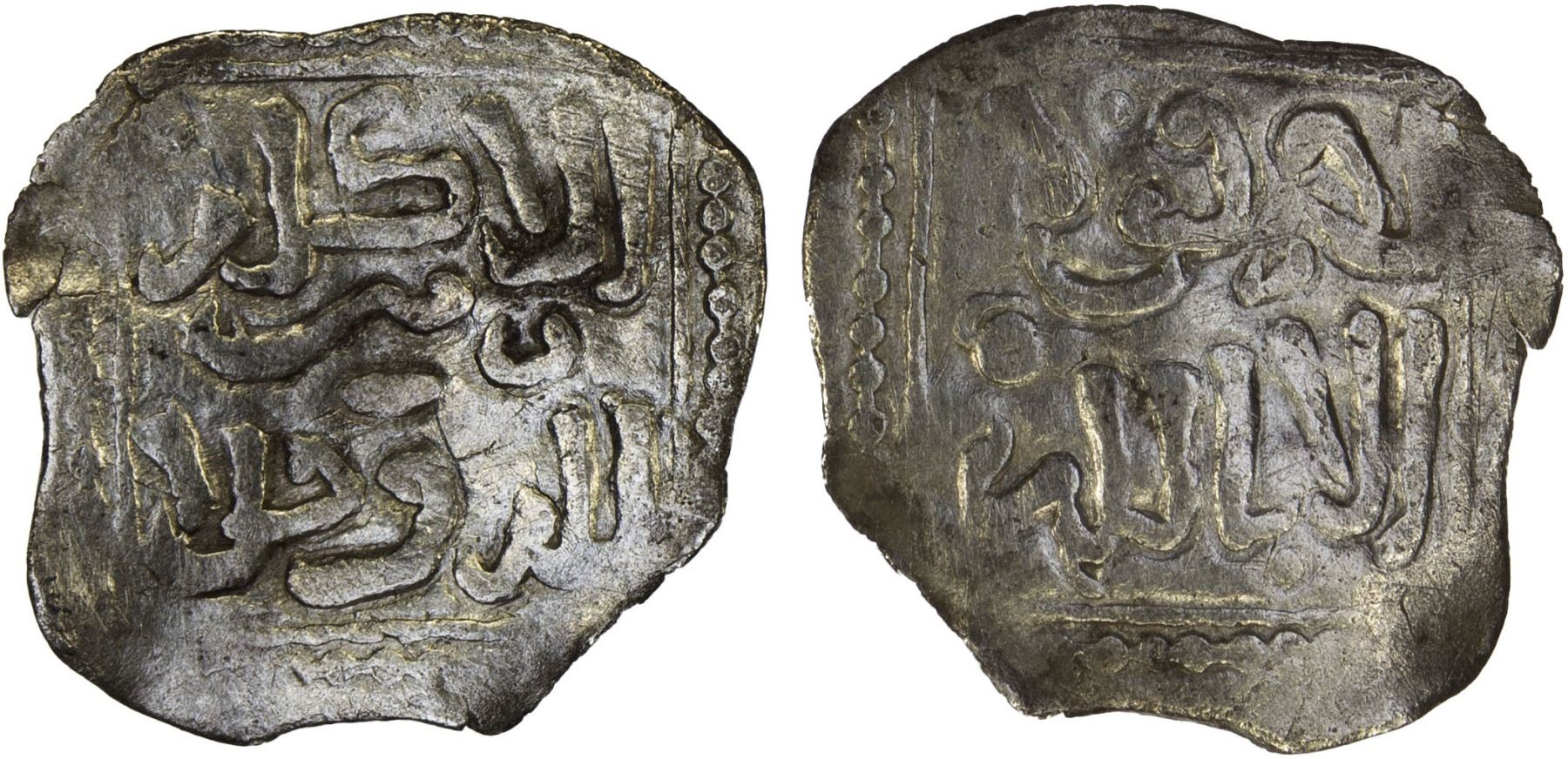 MERINID: Anonymous, ca. 1350-1450, AR squarish 1/2 dirham (0.45g), NM, ND, A-547D:C, Hohertz-853, legends al-amr kulluhu lillah wahid // la quwwa ila billah, VF, R.