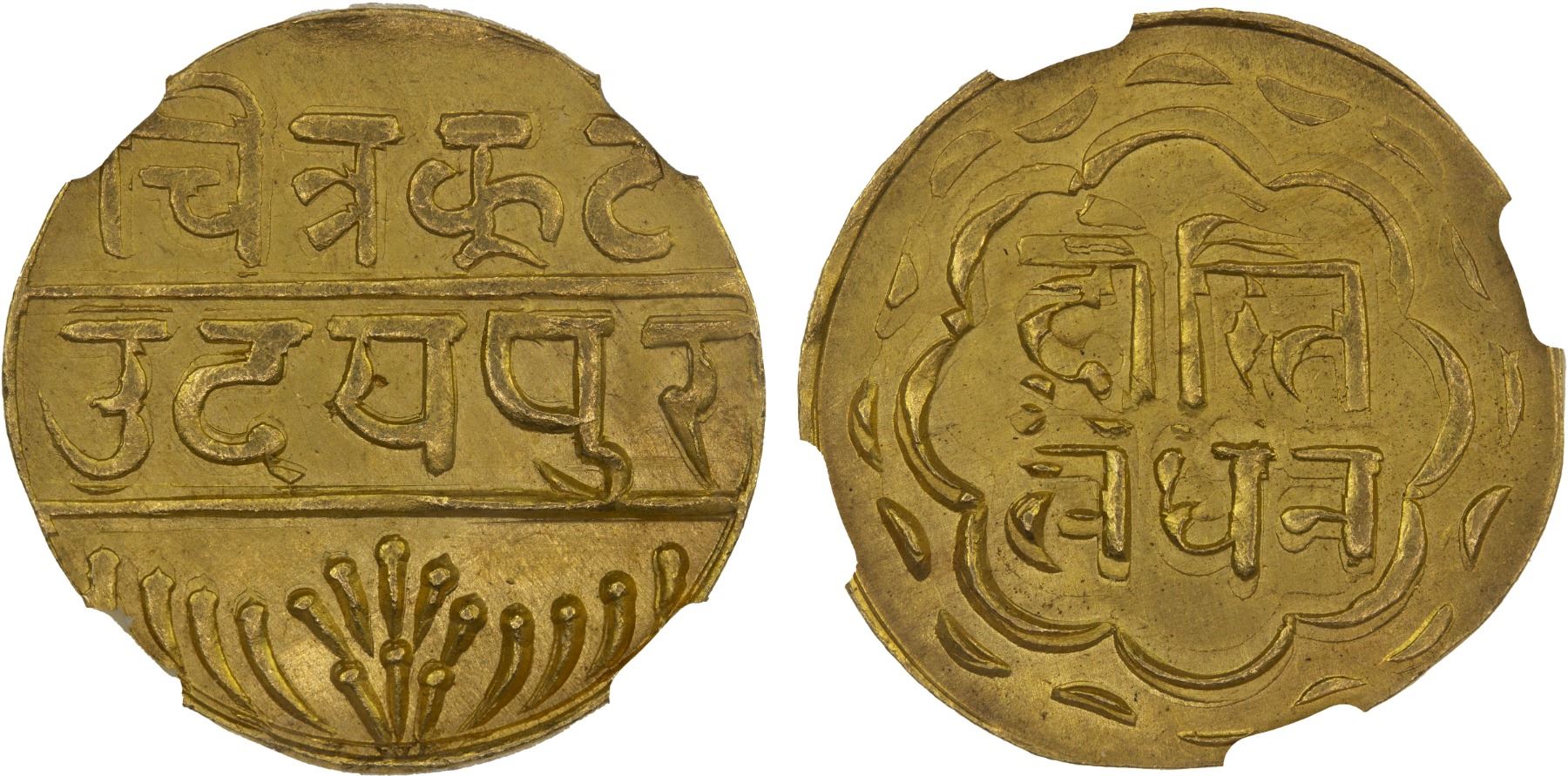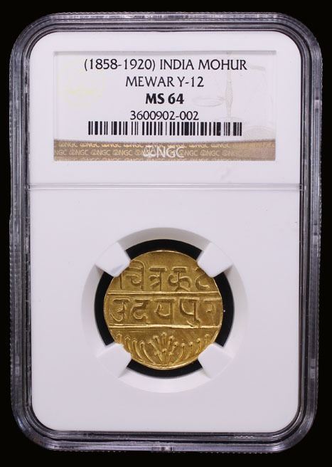 MEWAR: AV mohur, Udaipur, ND (1858-1920), Y-12. Fr-1326, Swarupshahi series, double struck, lustrous, NGC graded MS64, ex Heritage Auction 3020 Lot 24283, ex The 1914 Collection.