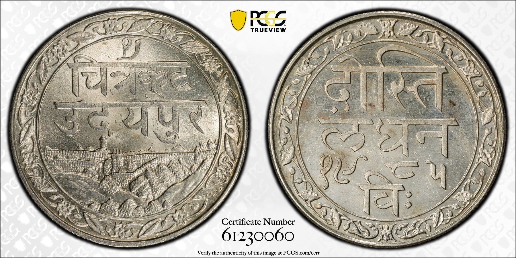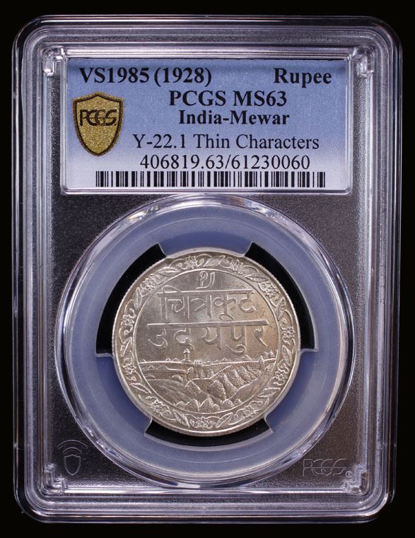 MEWAR: Fatteh Singh, 1884-1929, AR rupee, Udaipur, VS1985 (1928), Y-22.1, Swarupshahi series, dosthi londhon (Friendship with London) legend, thin characters variety, a lovely mint state example! PCGS graded MS63. Approximately half the mintage were struck later at the Calcutta mint in 1931.
