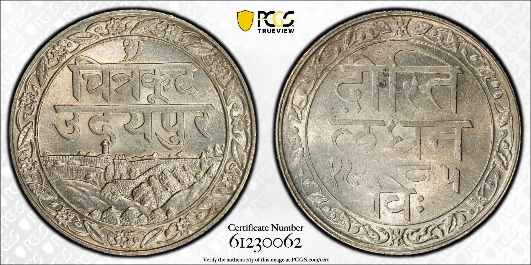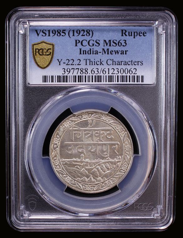 MEWAR: Fatteh Singh, 1884-1929, AR rupee, Udaipur, VS1985 (1928), Y-22.2, Swarupshahi series, dosthi londhon (Friendship with London) legend, thick characters variety, a lovely mint state example! PCGS graded MS63. Approximately half the mintage were struck later at the Calcutta mint in 1931.