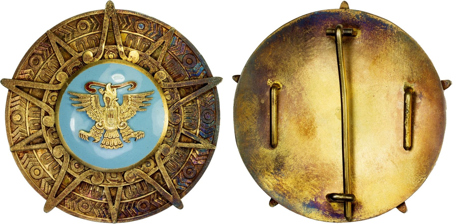 MEXICO: AE Order of the Aztec Eagle, Plaque (Placa) class, breast star, Order of the Aztec Eagle (Orden Mexicana del Águila Azteca), AU, ex Joseph E. Lang Collection. The Mexican Order of the Aztec Eagle forms part of the Mexican Honors System and is the highest Mexican order awarded to foreigners. It was created by decree on December 29, 1933, by President Abelardo L. Rodríguez as a reward for the services given to Mexico or humankind by foreigners. Its naming is partially taken from the Imperial Order of the Mexican Eagle, which was created by Maximilian I of Mexico on January 1, 1865. There is some design similarity of the order with the coat of arms of Mexico, particularly the golden eagle holding a rattlesnake, which is associated with the Aztec civilization.A disc with a five-pointed star and five inner points, in the center of which is a turquoise enamel circle, surmounted in gold by the Aztec eagle of Cuauhtémoc. It is awarded to undersecretaries or deputy ministers of state, chargés d'affaires, consuls general, brigadier generals, rear admirals, vice admirals, and those of equivalent rank.