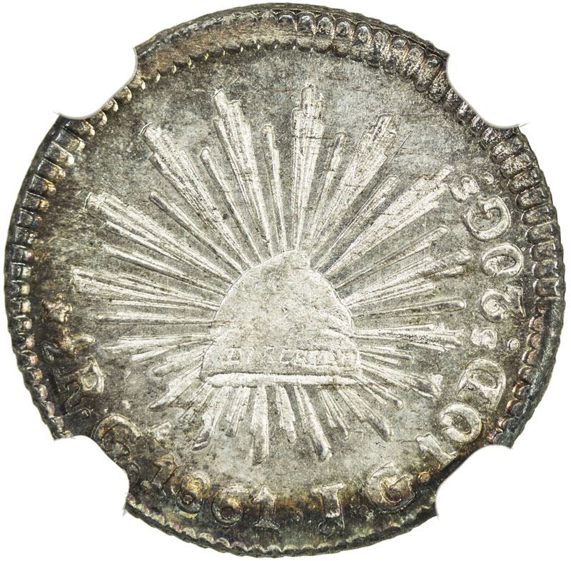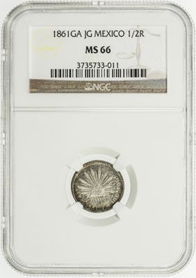 MEXICO: AR ½ real, 1861-Ga, KM-370.5, assayer JG, gorgeous golden chocolate toning towards the rim, highest graded by NGC (August 2014), NGC graded MS66.