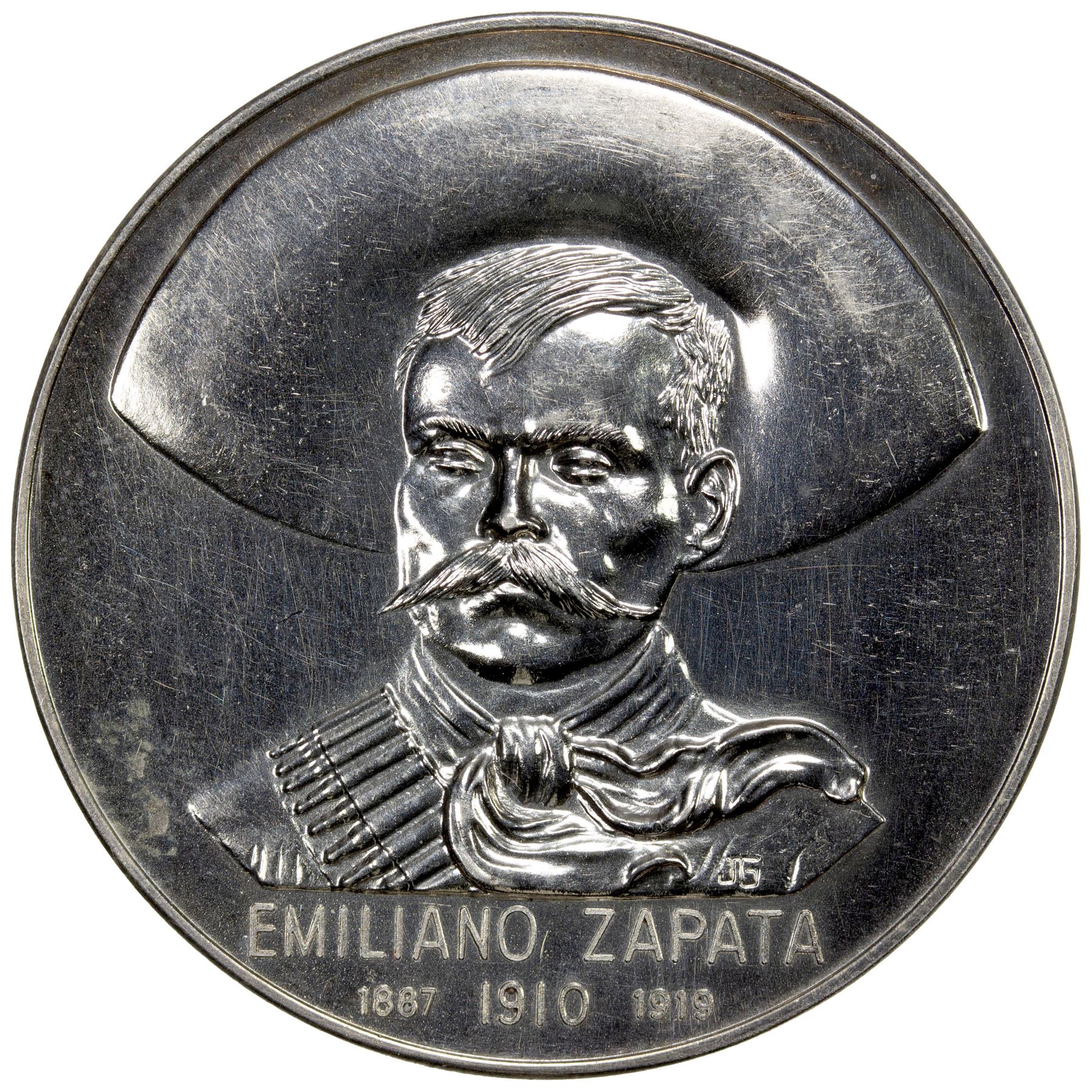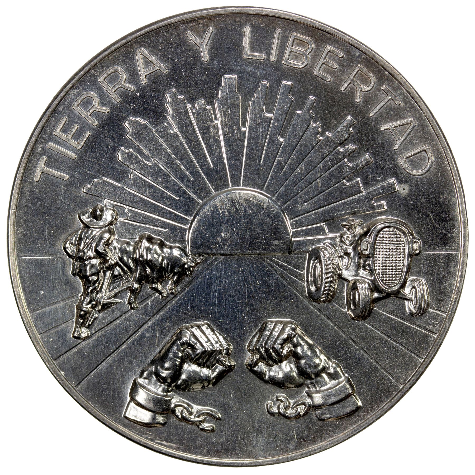 MEXICO: AR medal (25.95g), ND, 37mm, portrait of Emiliano Zapata in traditional attire with EMILIANO ZAPATA 1910 / 1887-1919 // TIERRA Y LIBERTAD around rising sun with farmer with plow, tractor, and bound hands breaking chains, Unc.