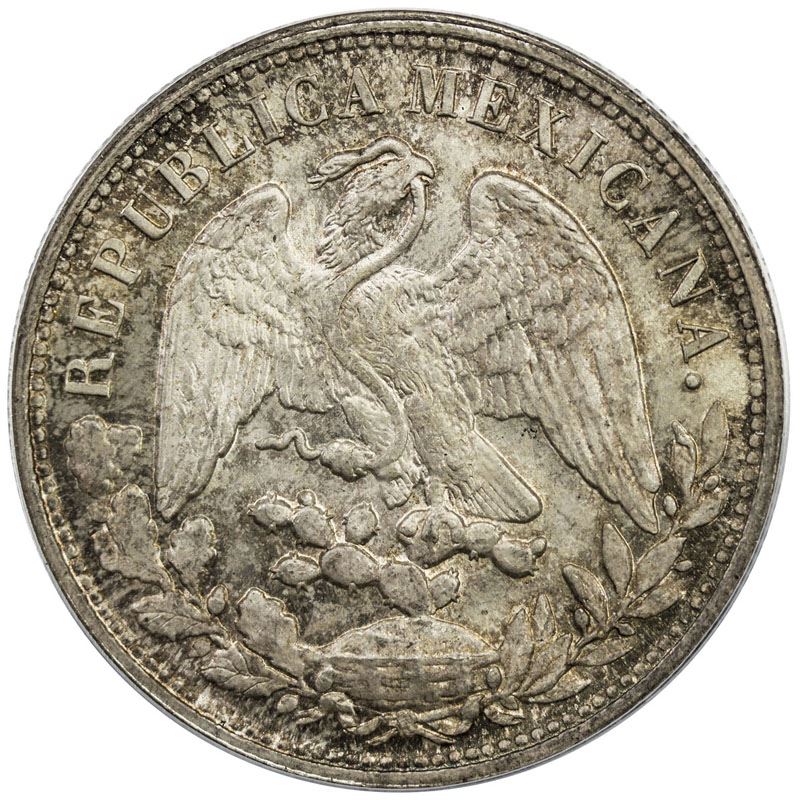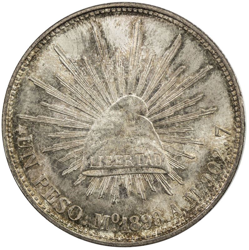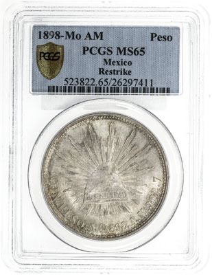 MEXICO: AR peso, 1898-Mo restrike, KM-409.2, assayer AM, lovely golden toning, PCGS graded MS65. In 1949 the San Francisco Mint struck 2,000,000 Mexican pesos dated 1898 for use in China. The 1898 original reverse has 139 denticles and the restrike has 134. The original coins have the tops of the "Mo" lined up and the restrikes have the "o" in "Mo" moved higher than the "M". These were made for the Chiang Kai-Shek Nationalist government (Kuomintang) which had introduced a new silver-based currency. The Nationalists were losing the Chinese civil war to Mao Tse-Tung's Communists and there was rampant inflation in the areas still controlled by the Nationalists.
