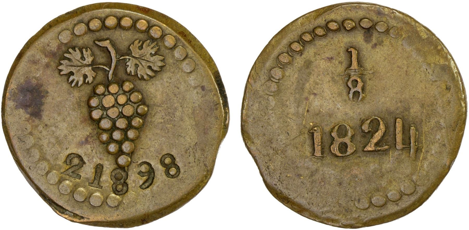 MEXICO: Aguascalientes, AE 1/8 real, 1824, Rulau-Agu-26, 21mm, municipal copper, bunch of grapes with incuse number 21898 stamped below // small 1/8 with date below, beaded border on both sides, somewhat crude manufacture, a couple faint reverse scratches, VF, ex SARC Auction 27, Lot 1794.