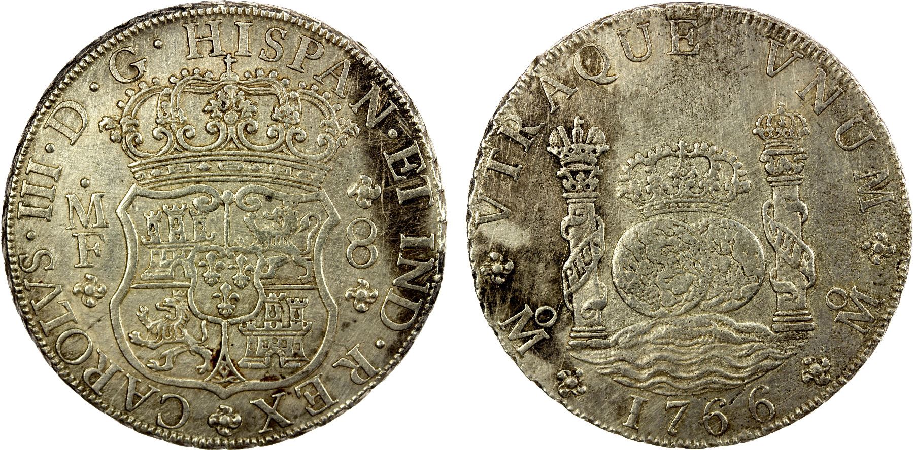 MEXICO: Carlos III, 1759-1788, AR 8 reales, 1766-Mo, KM-105, "Pillar" or "Columnario" type, assayer MF, light porosity, XF.