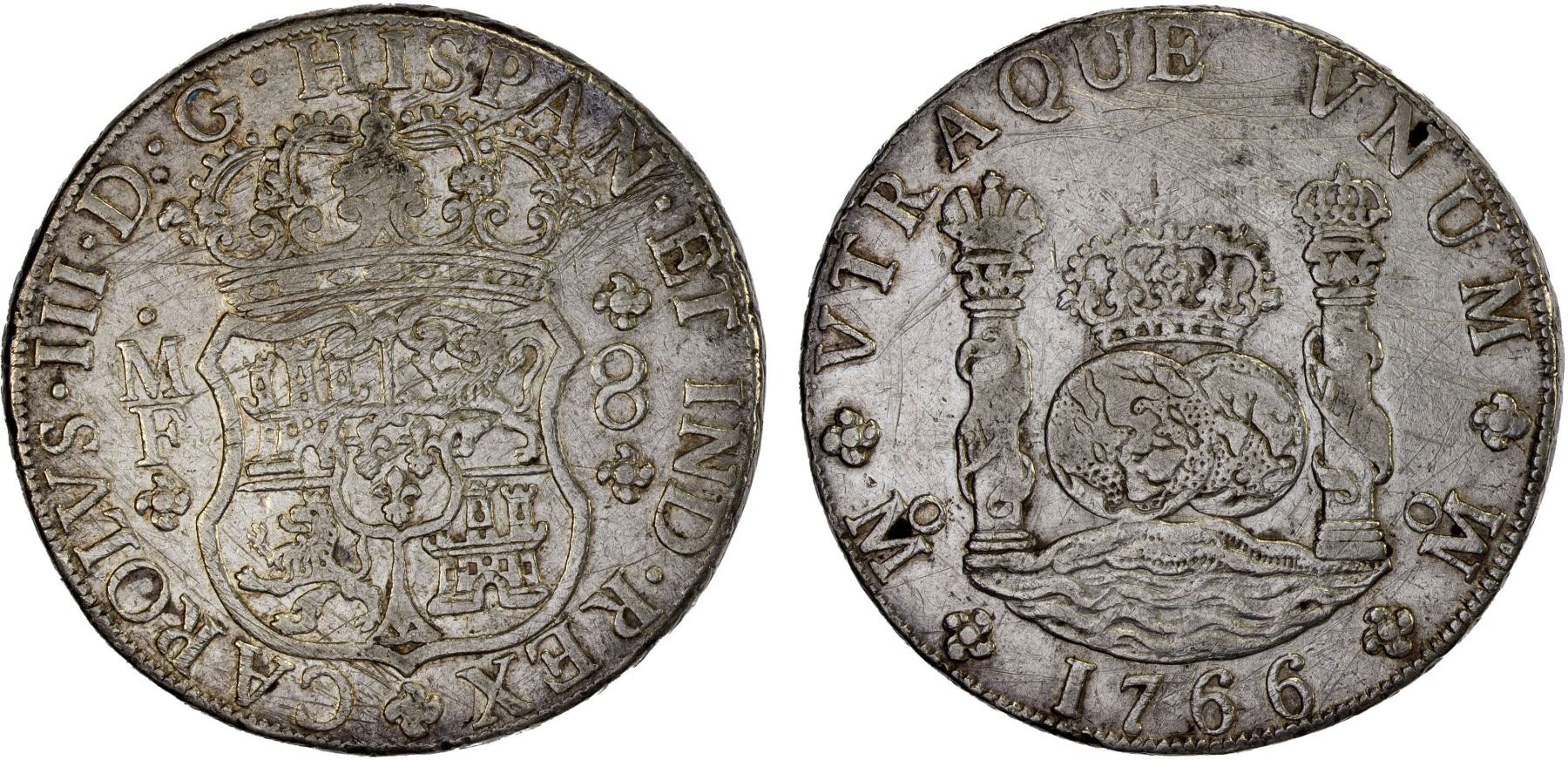 MEXICO: Carlos III, 1759-1788, AR 8 reales, 1766-Mo, KM-105, assayer MF, pillar (columnario) type, harshly cleaned, scratches on both sides, XF.