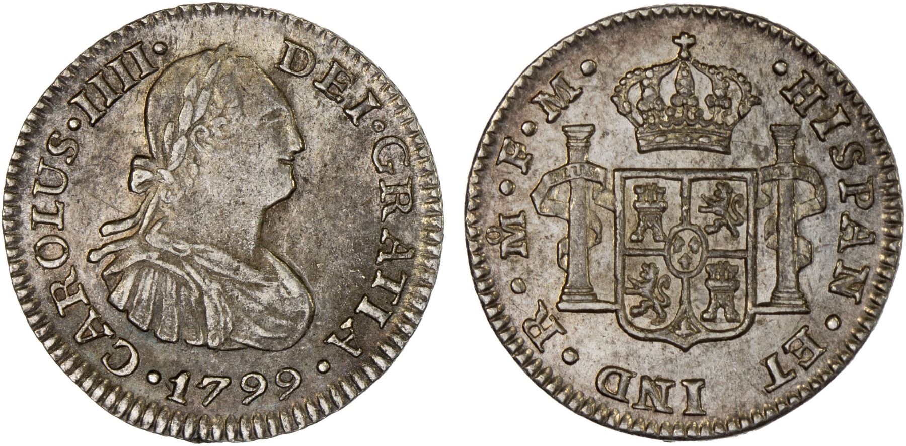MEXICO: Carlos IV, 1788-1808, AR 1/2 real, 1799-Mo, KM-72, assayer FM, very lightly toned, lustrous, AU.