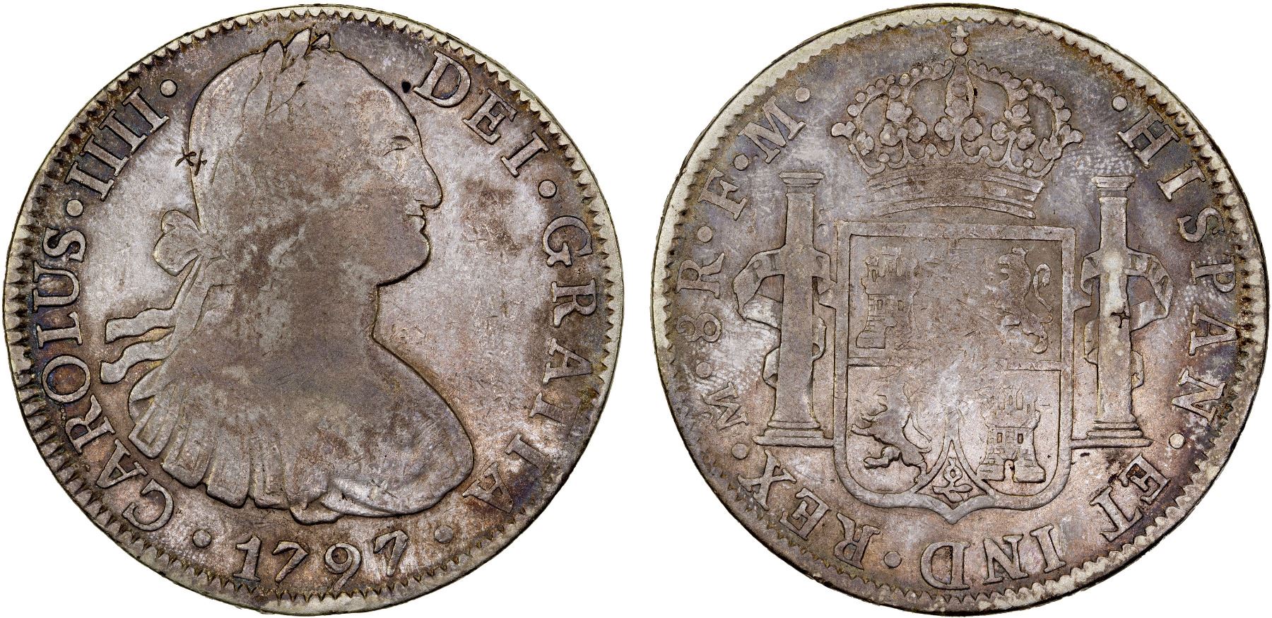 MEXICO: Carlos IV, 1788-1808, AR 8 reales, 1797-Mo, KM-109, assayer FM, a couple small chopmarks, one on each side, F-VF.
