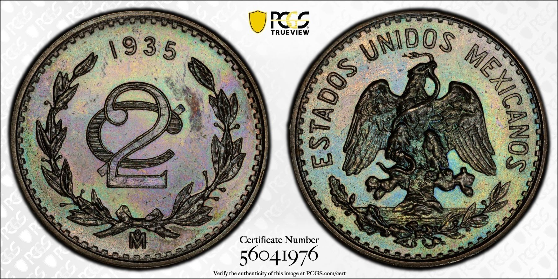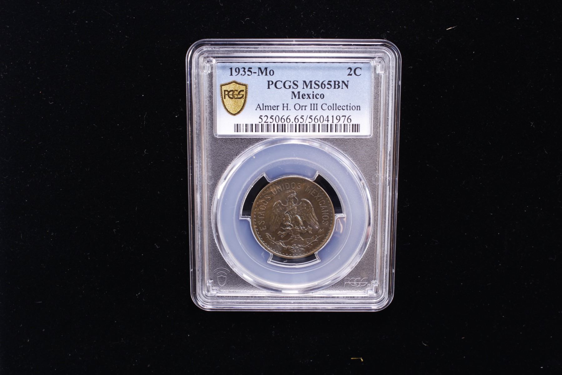 MEXICO: Estados Unidos, AE 2 centavos, 1935, KM-419, better date, very nice coloration, PCGS graded MS65 BN, ex Almer H. Orr III Collection.