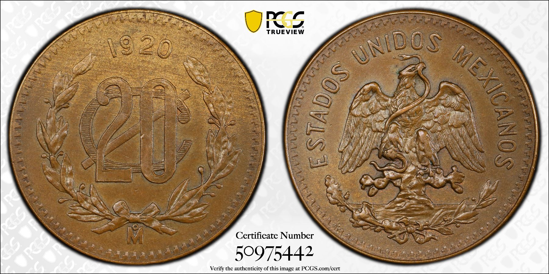 MEXICO: Estados Unidos, AE 20 centavos, 1920-Mo, KM-437, a pleasing brown lustrous example, PCGS graded MS62 BN.