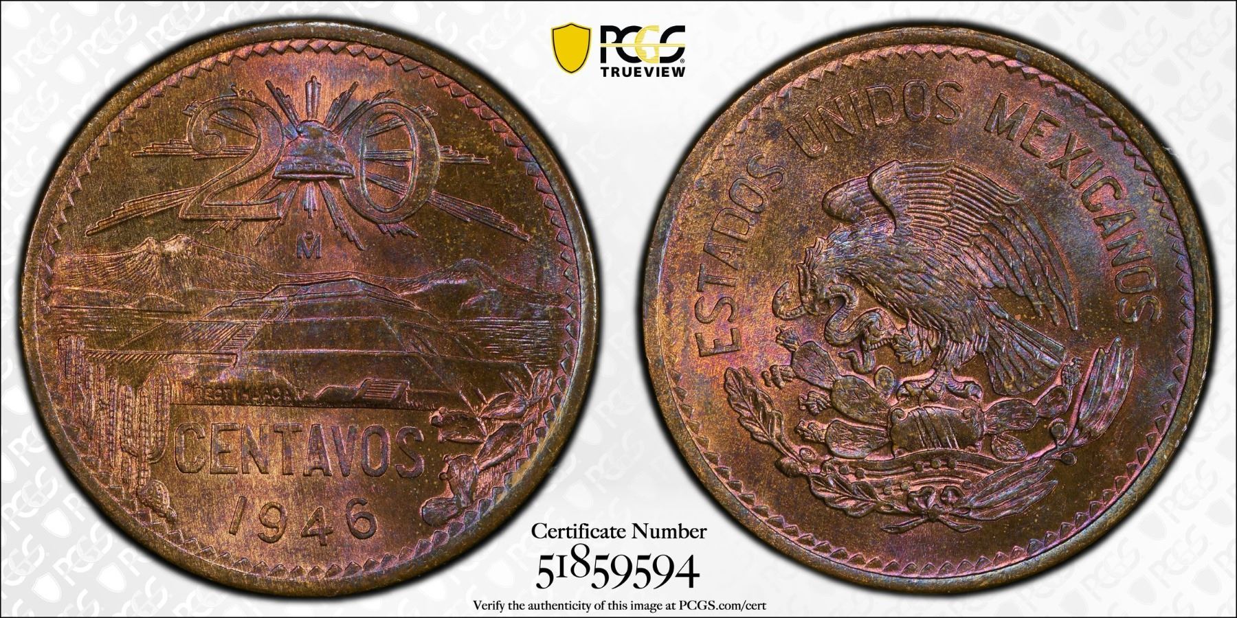 MEXICO: Estados Unidos, AE 20 centavos, 1946-Mo, PCGS MS65 RB