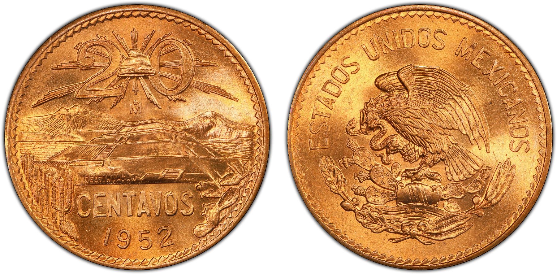 MEXICO: Estados Unidos, AE 20 centavos, 1952-Mo, KM-439, a fantastic quality example! PCGS graded MS66 RD.