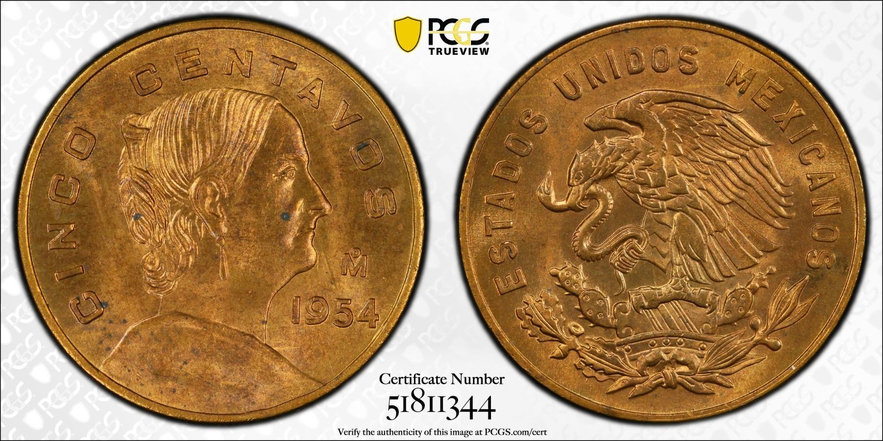 MEXICO: Estados Unidos, AE 5 centavos, 1954-Mo, PCGS MS65