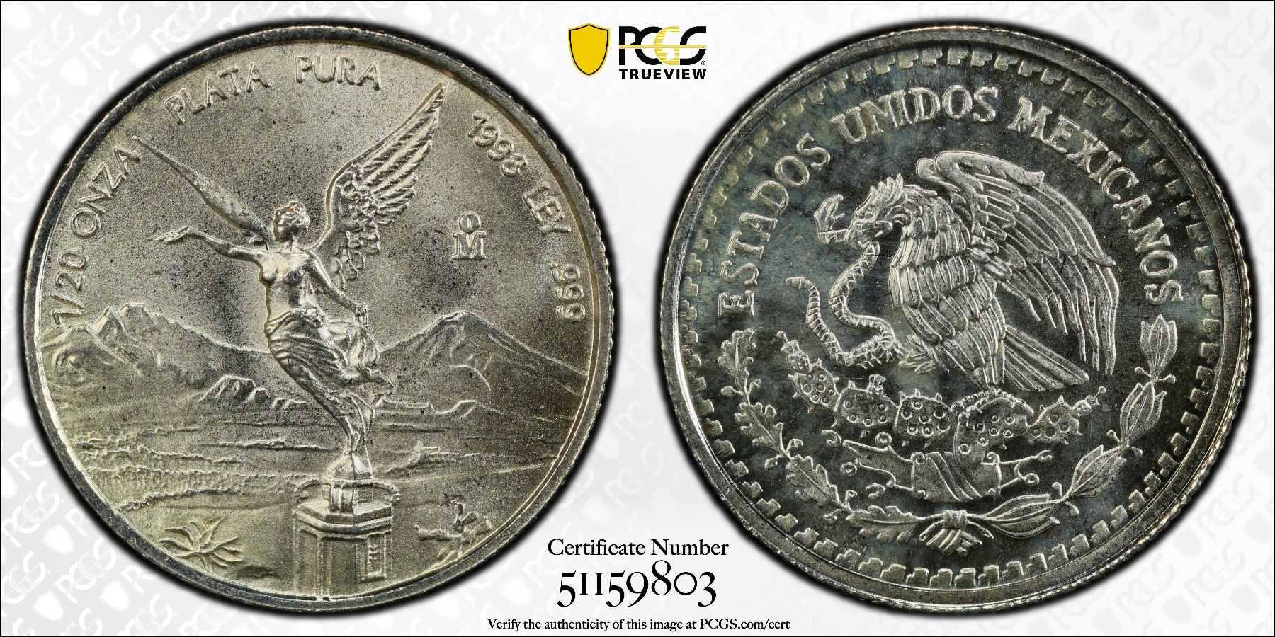 MEXICO: Estados Unidos, AR 1/20 onza, 1998-Mo, KM-609, Libertad, a spectacular example, PCGS graded MS68.