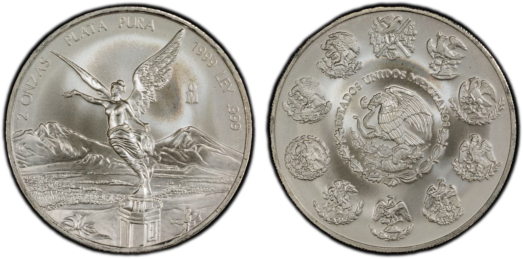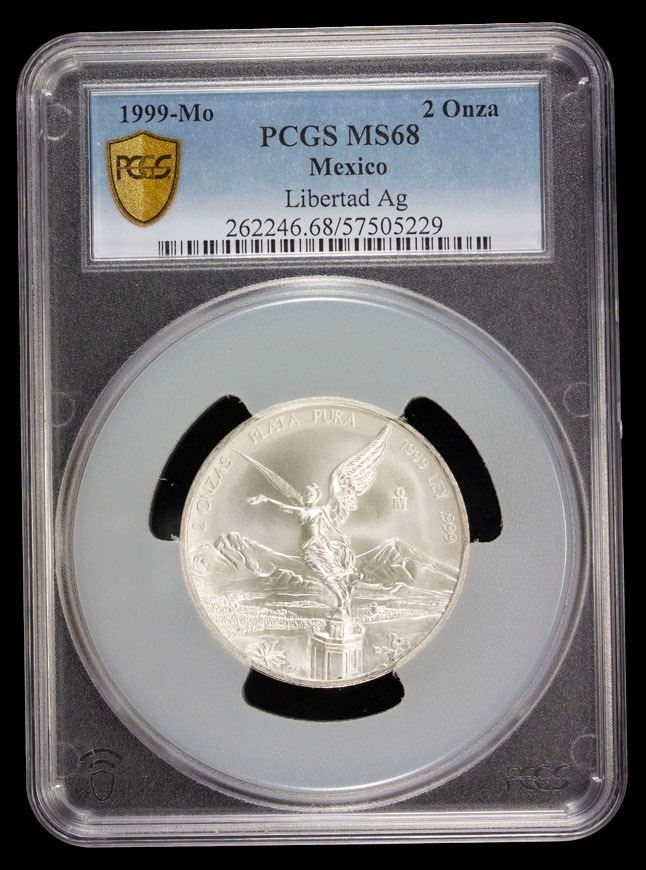 MEXICO: Estados Unidos, AR 2 onzas, 1999-Mo, KM-614, "Libertad" Series, contains 2 troy ounces of pure silver, PCGS graded MS68.