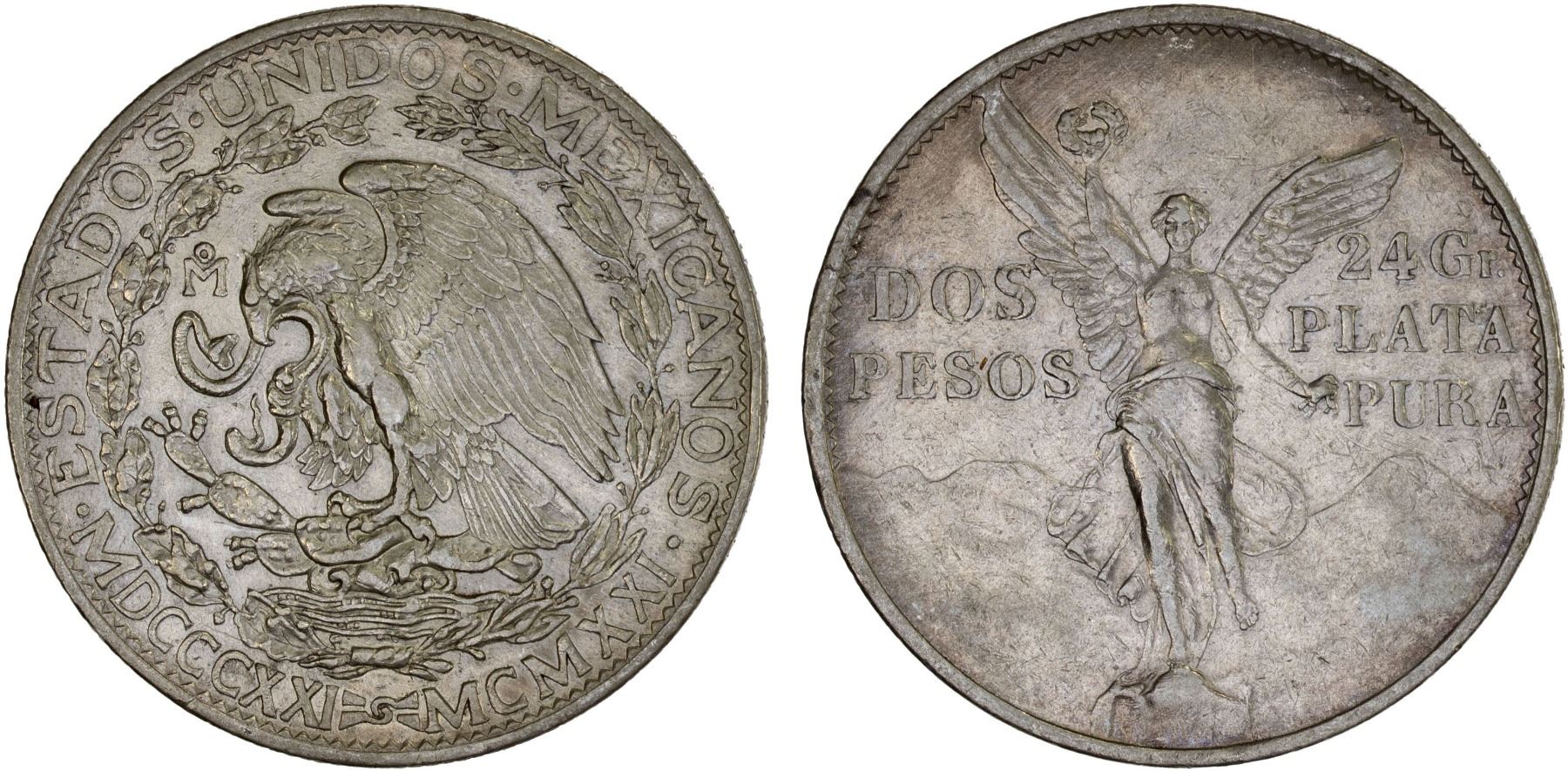 MEXICO: Estados Unidos, AR 2 pesos, 1921-Mo, KM-462, Centennial of Independence, lightly cleaned, XF.