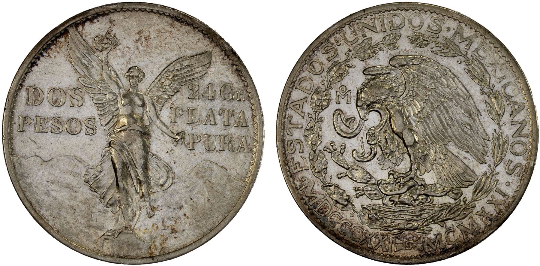 MEXICO: Estados Unidos, AR 2 pesos, 1921, KM-462, Centennial of Independence, lightly cleaned, still lustrous and attractive, XF.