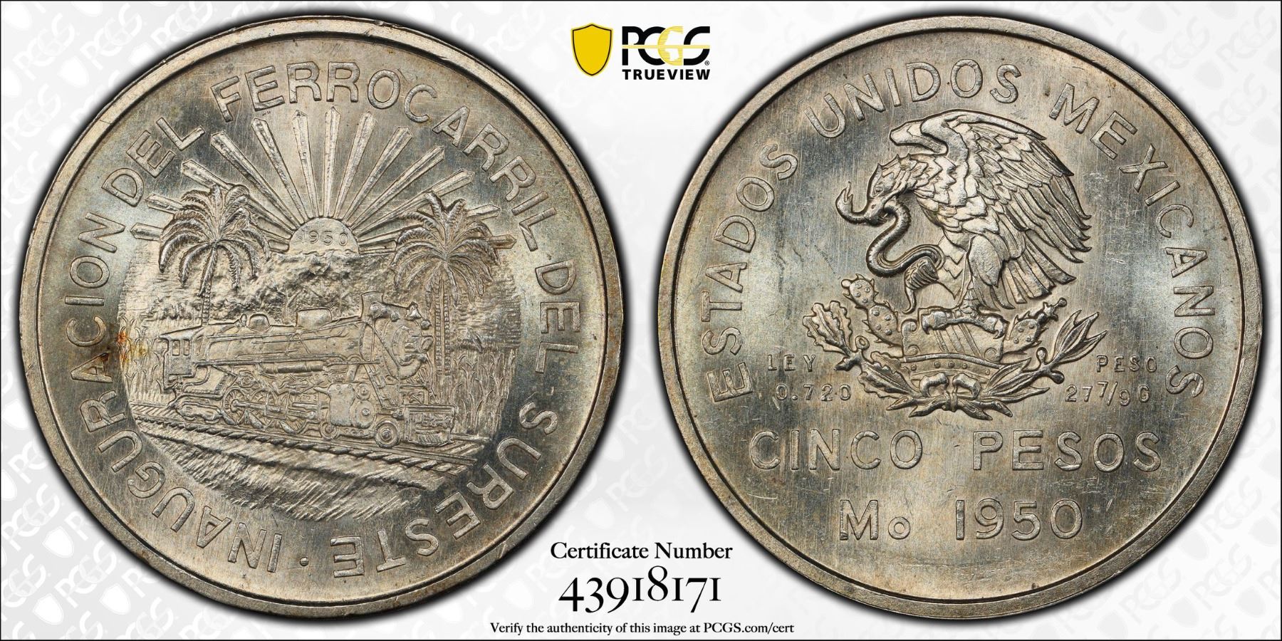 MEXICO: Estados Unidos, AR 5 pesos, 1950-Mo, KM-466, Opening of the Southeastern Railroad Commemorative, a fantastic quality example! PCGS graded MS66.