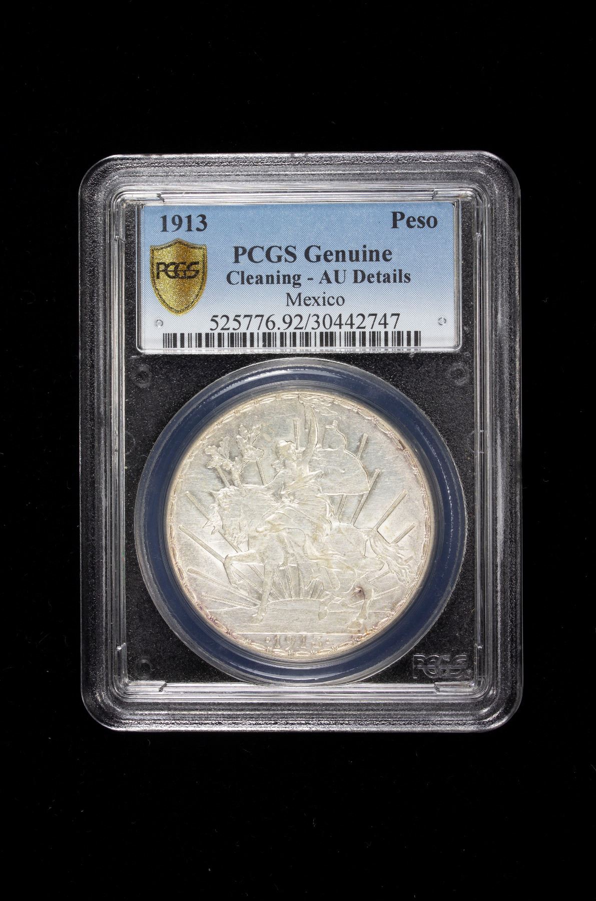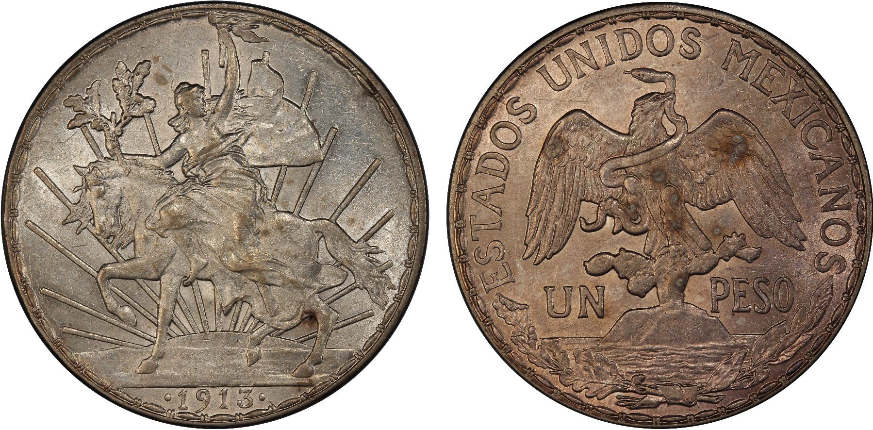 MEXICO: Estados Unidos, AR peso, 1913, KM-453, Caballito type, light hairlines, nice rose toning on obverse, PCGS graded AU details.