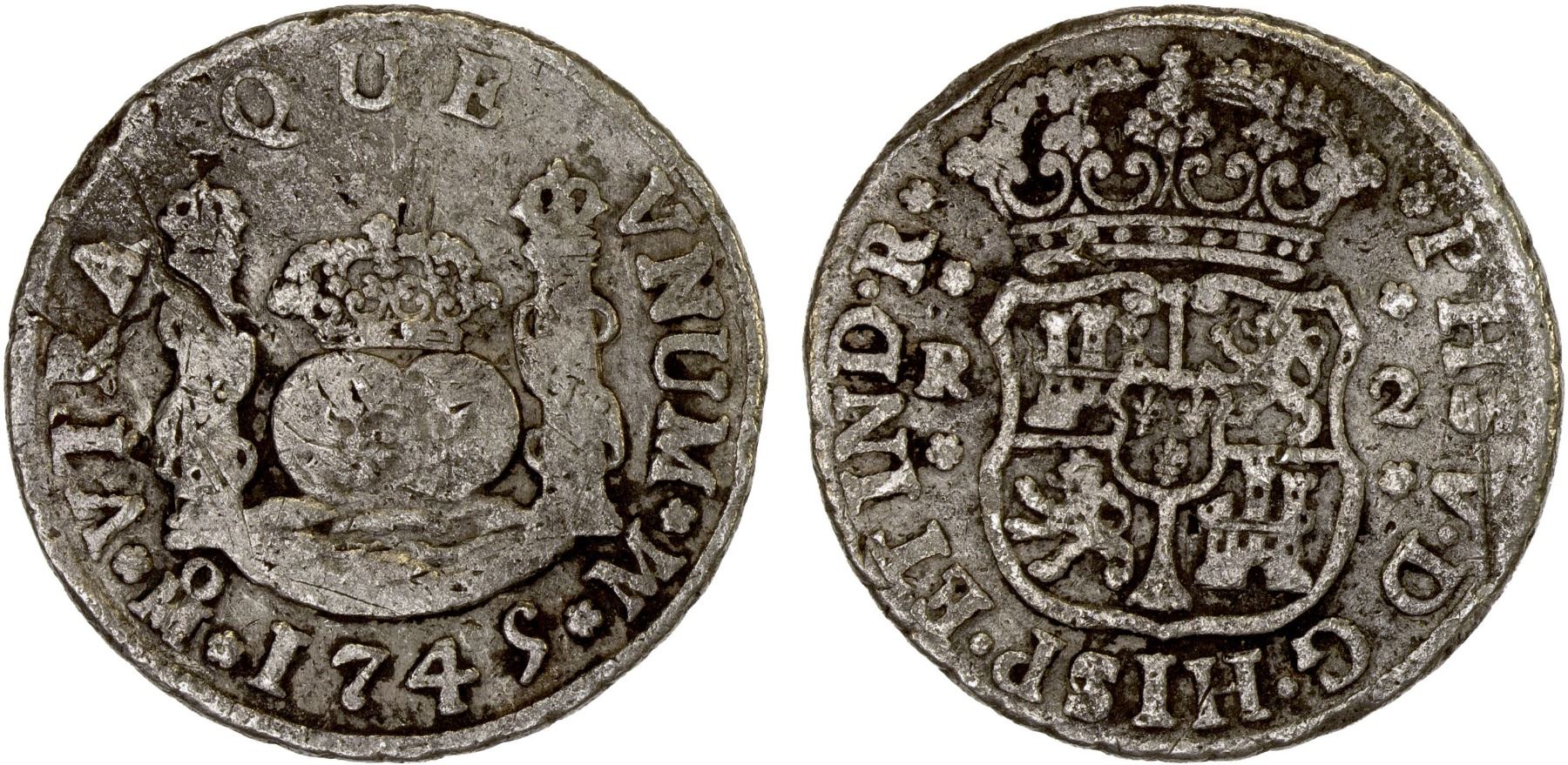 MEXICO: Felipe V, 1700-1746, AR 2 reales, 1745-Mo, KM-85, "pillar" or "columnario" type, assayer M, scratches, F-VF.