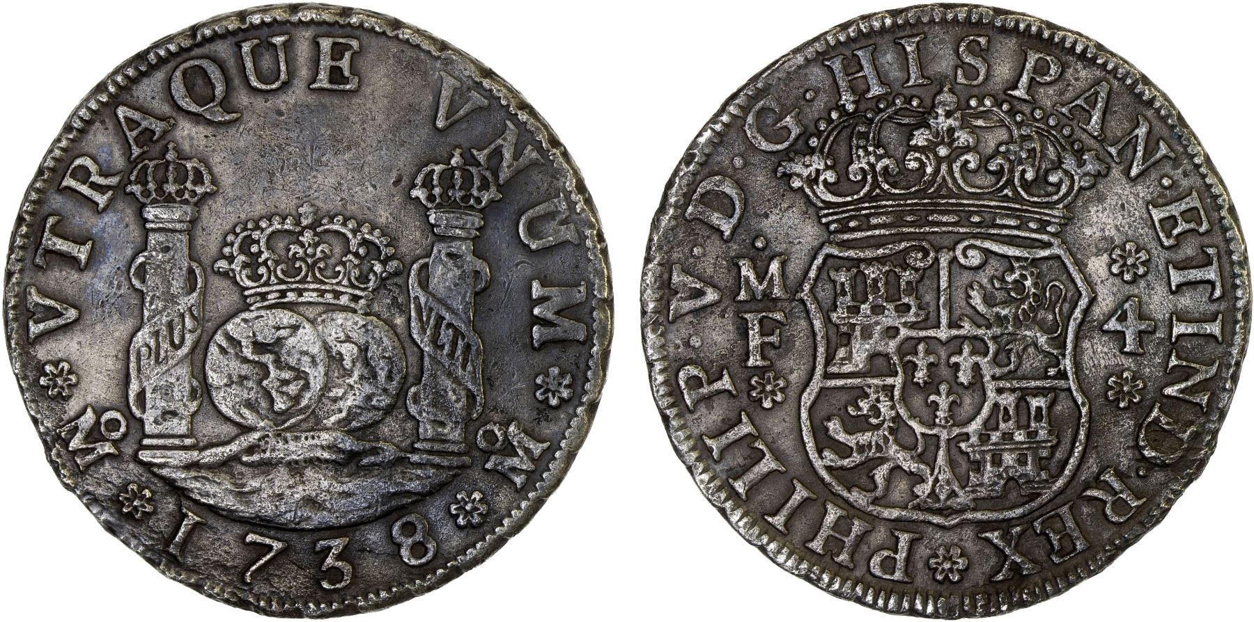 MEXICO: Felipe V, 1700-1746, AR 4 reales, 1738-Mo, KM-94, assayer MF, Pillar type, minimal oxidation from saltwater immersion, VF.