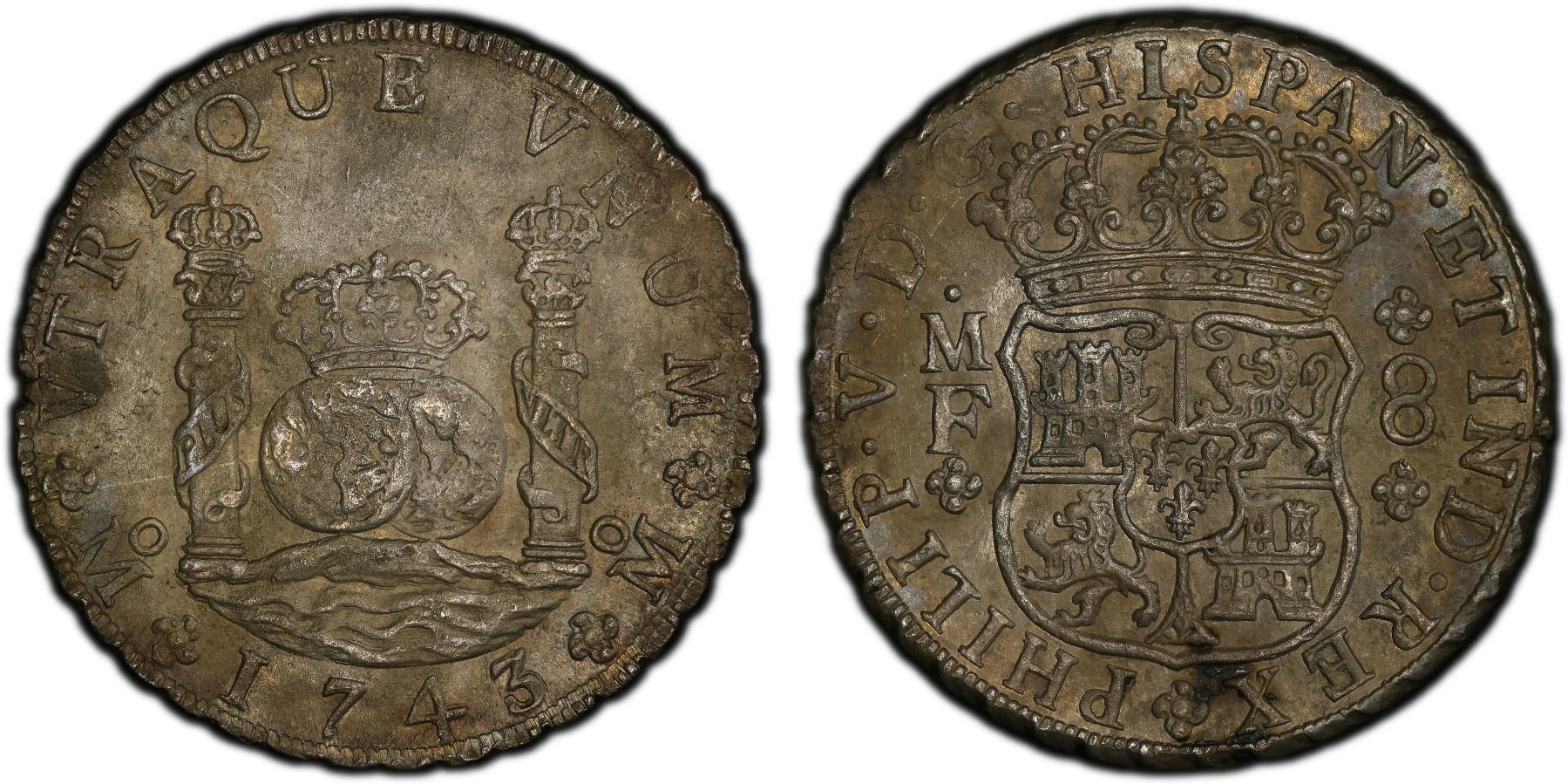 MEXICO: Felipe V, 1700-1746, AR 8 reales, 1743-Mo, KM-103, Cal-1463, "pillar" or "columnario" type, assayer MF, environmental damage, PCGS graded AU details, ex Almer H. Orr III Collection.
