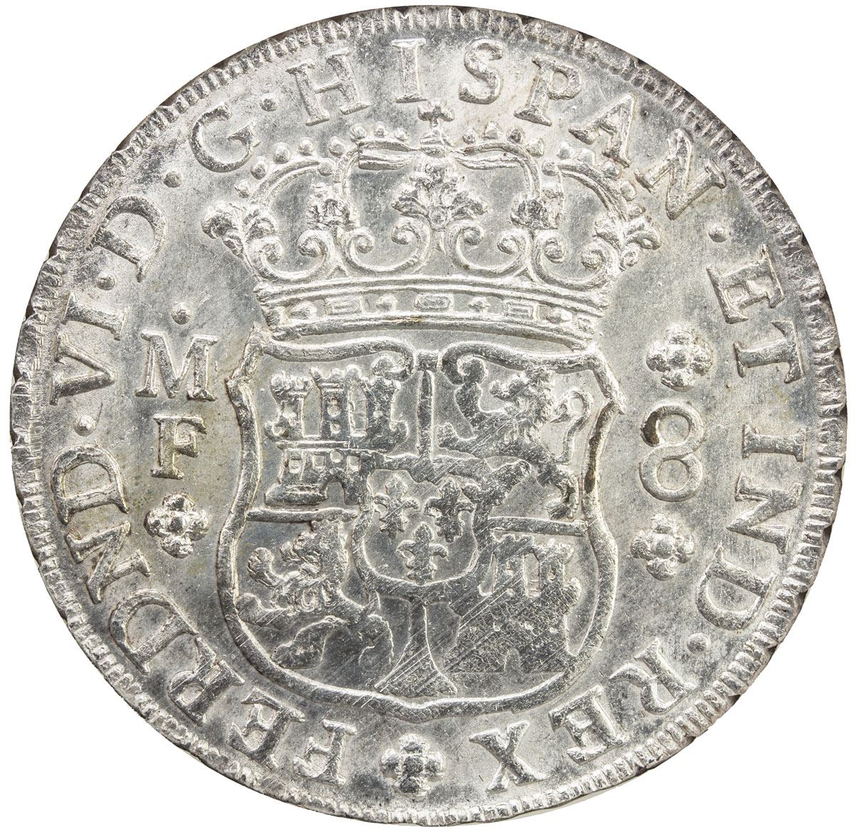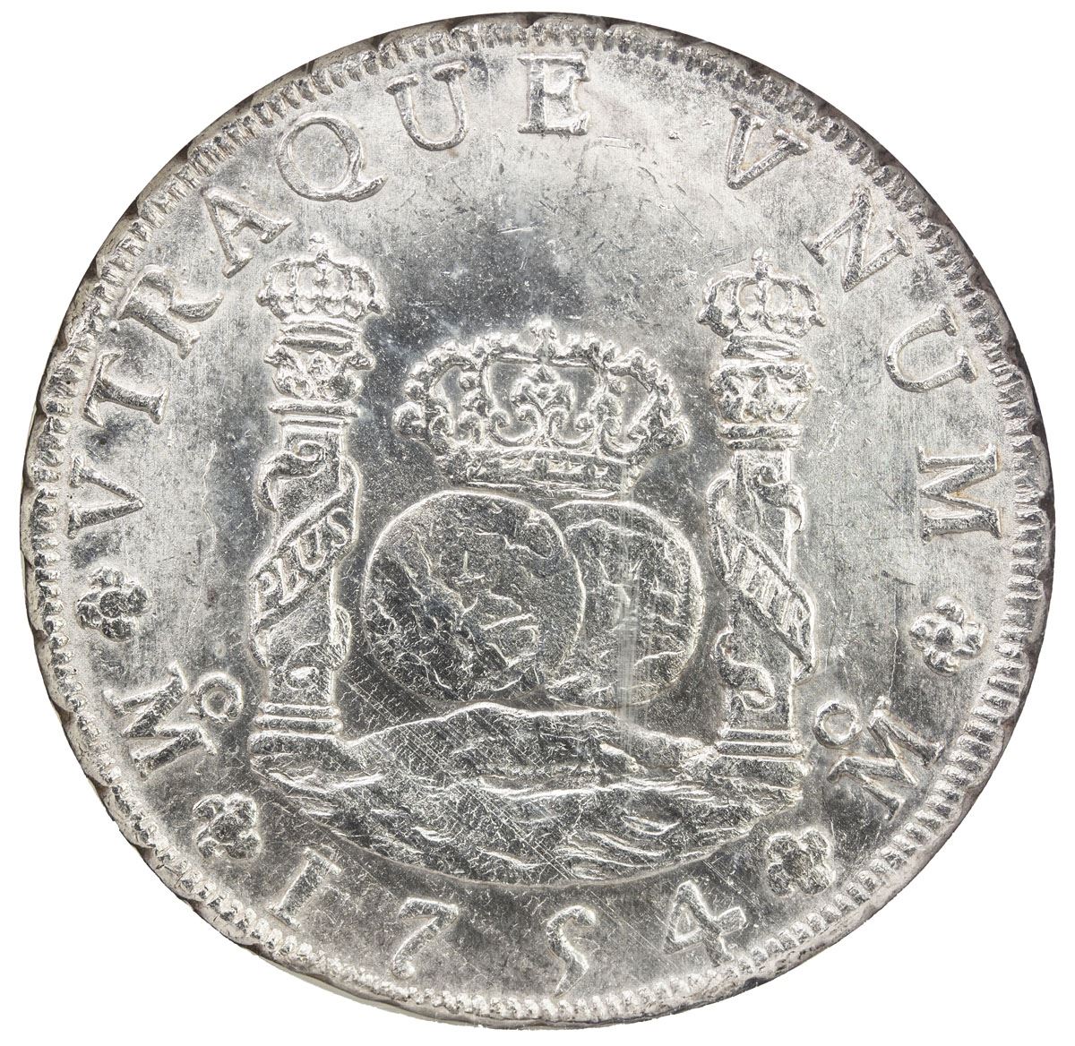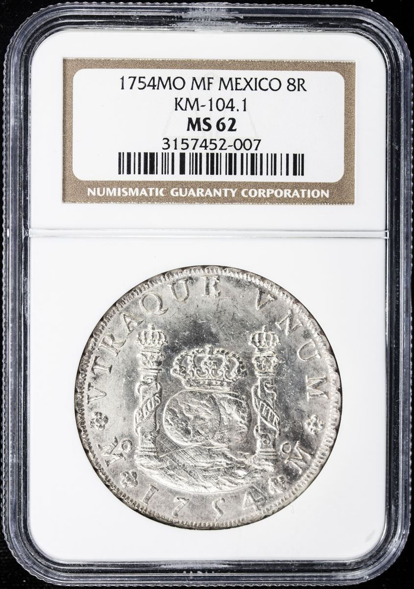 MEXICO: Fernando VI, 1746-1759, AR 8 reales, 1754-Mo, KM-104.1, "pillar dollar" or "columnario" type, assayer MF, a lovely example with lustrous satin surfaces! NGC graded MS62.