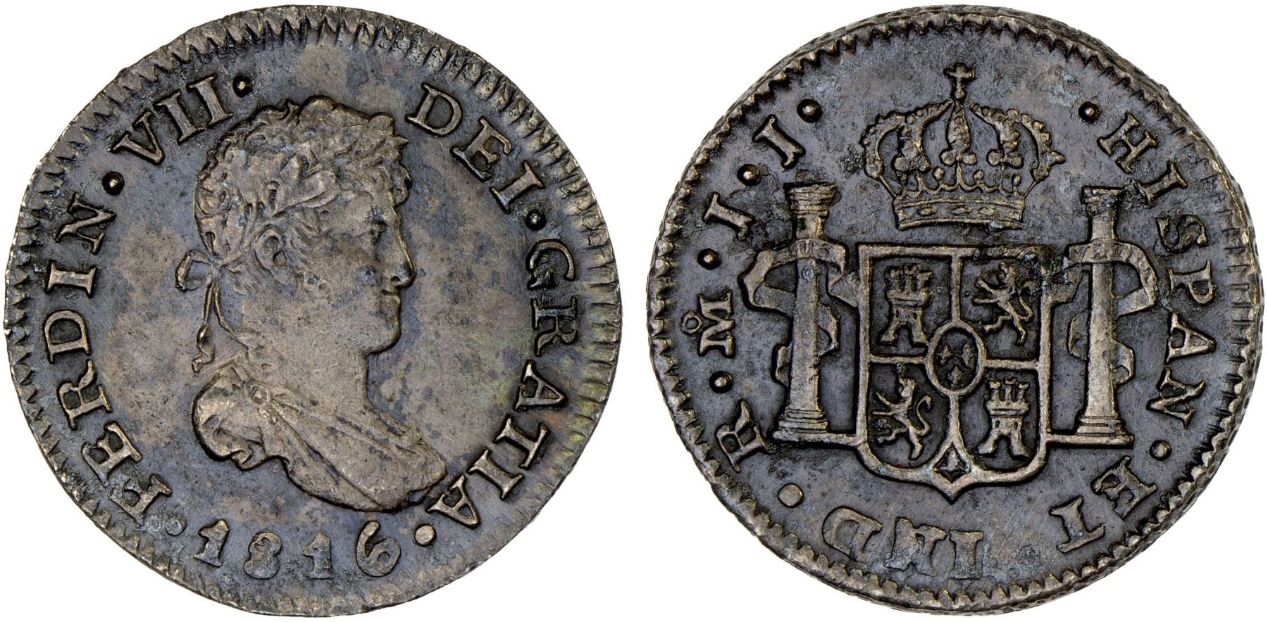 MEXICO: Fernando VII, 1808-1821, AR 1/2 real, 1816-Mo, KM-74, assayer JJ, very slight oxidation, nicely toned, Unc.