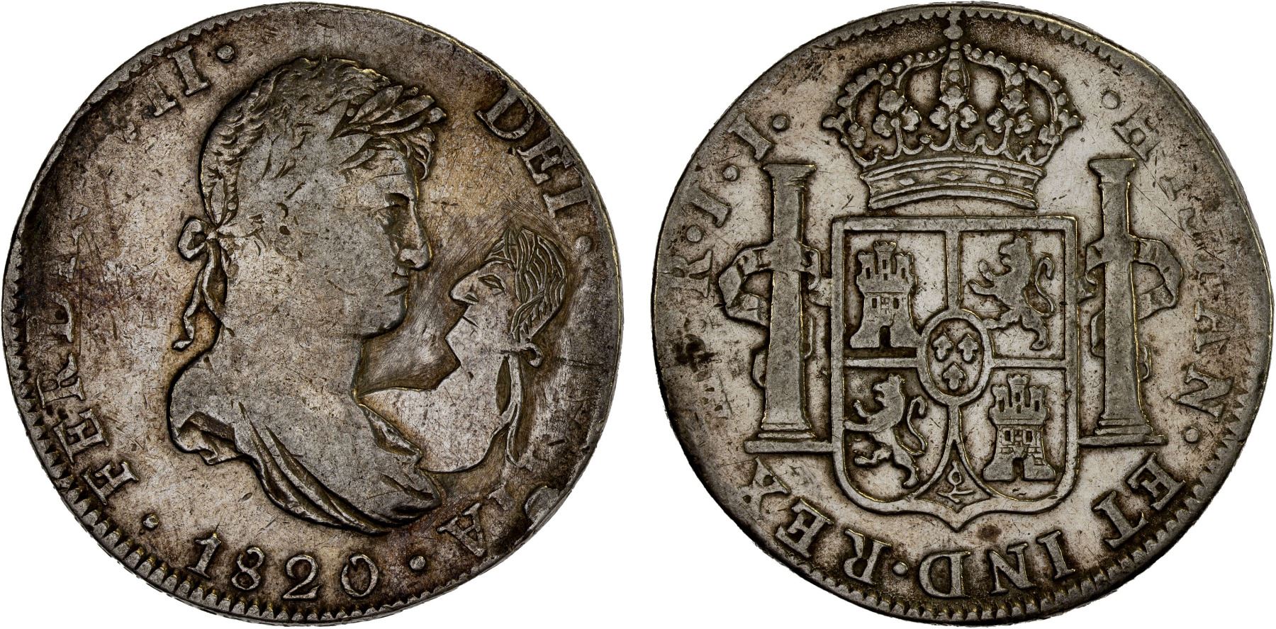 MEXICO: Fernando VII, 1808-1821, AR 8 reales, 1820-Mo, KM-111, assayer JJ, with an additional left-facing laureate bust carved into the obverse right field, lightly polished, VF. These pieces seem to have been unofficially modified as love tokens or as a political statement. See Gurney (pp. 179-182) for similar examples.