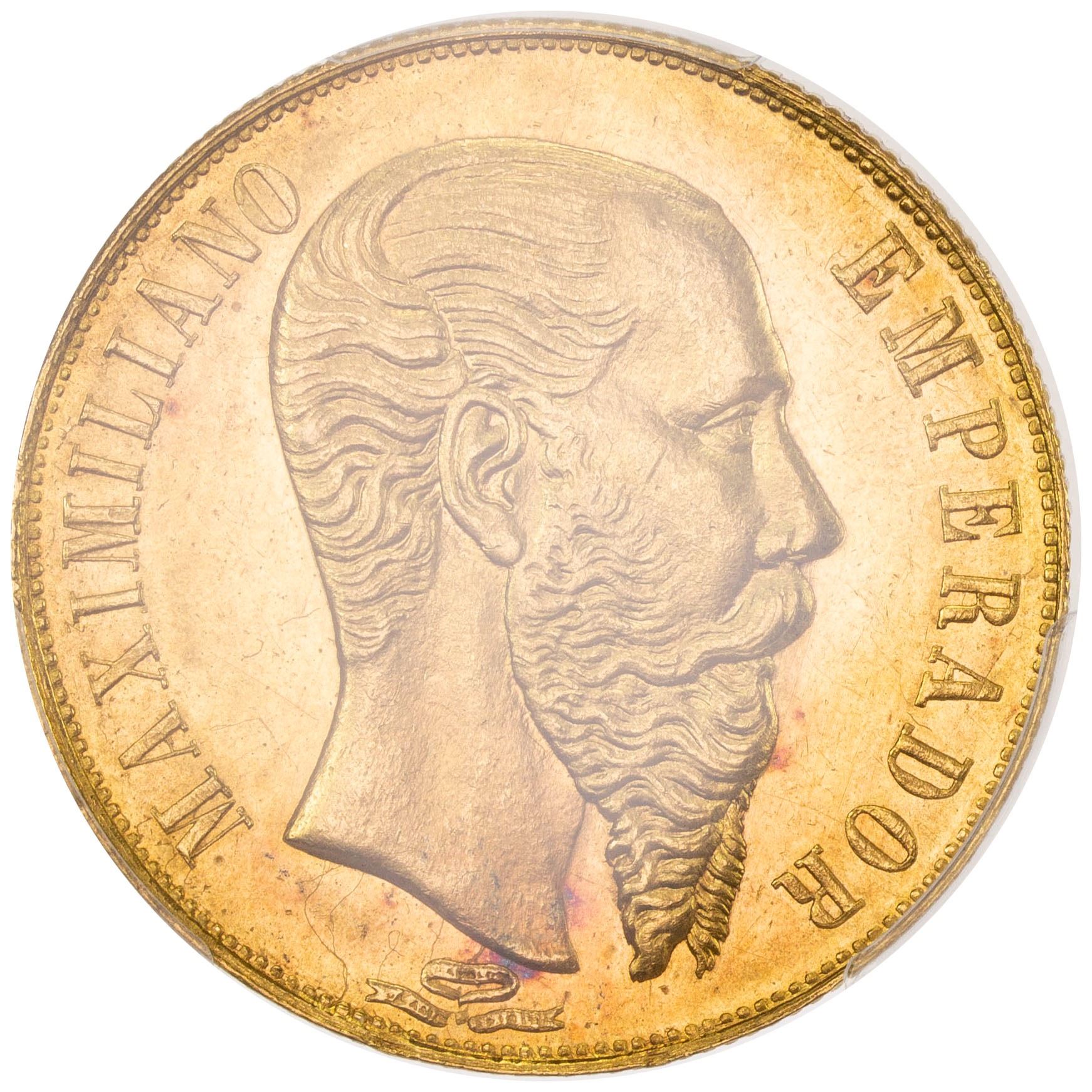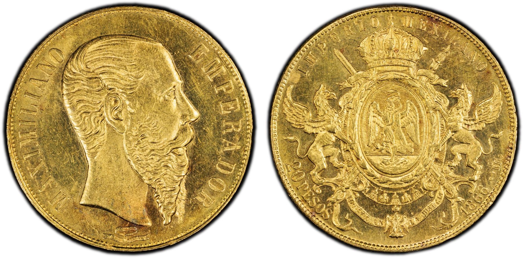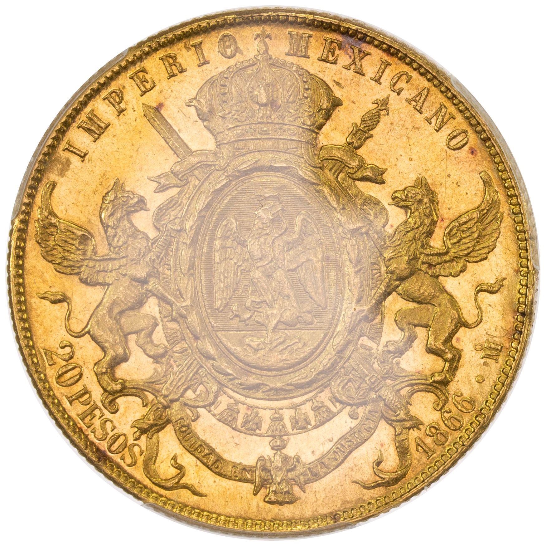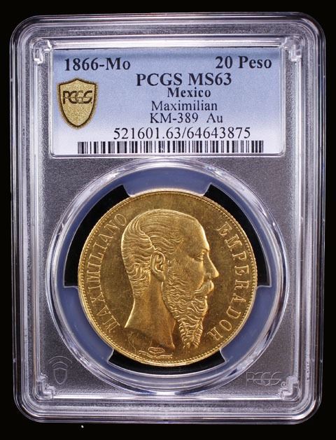 MEXICO: Maximiliano, 1864-1867, AV 20 pesos, Mexico City, 1866-Mo, KM-389, Fr-62, Grove-5445, bust of the emperor right // crowned imperial arms on top of crossed swords, flanked by griffins, the only denomination in gold issued by Maximilian, a lovely lustrous mint state example of this extremely popular type, PCGS graded MS63. On an interesting historical fact, Emperor Maximilian gave a 20 peso gold coin to each member of his firing squad before his execution on June 19, 1867, in Querétaro, Mexico. He reportedly did this as a traditional gesture, asking them to aim for his chest rather than his head so his face would remain recognizable for his mother.