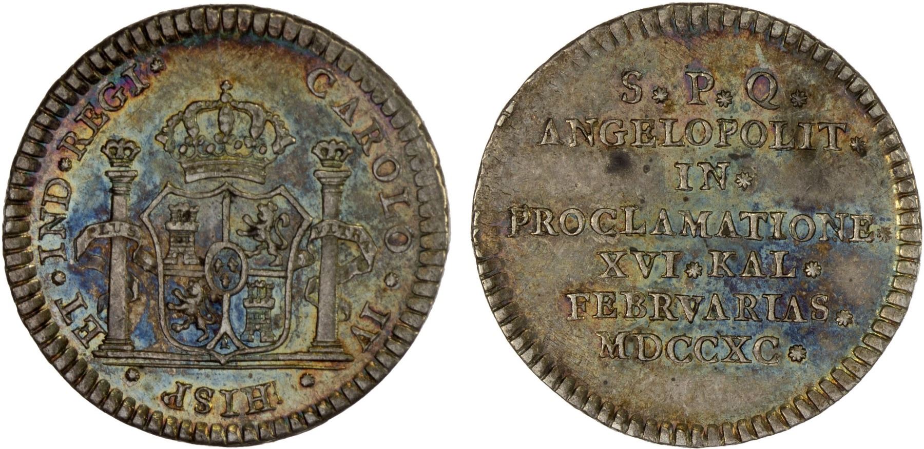 MEXICO: Puebla de Los Ángeles, AR proclamation medal (3.38g), 1790, Herrera-192, 1 real module, central arms with CAROLO IV HISP ET IND REGI around // S*P*Q* / ANGELOPOLIT* / IN* / PROCLAMATIONE* / XVI*KAL* / FEBRVARIAS* / MDCCXC*, nice iridescent toning, corded edge, AU.