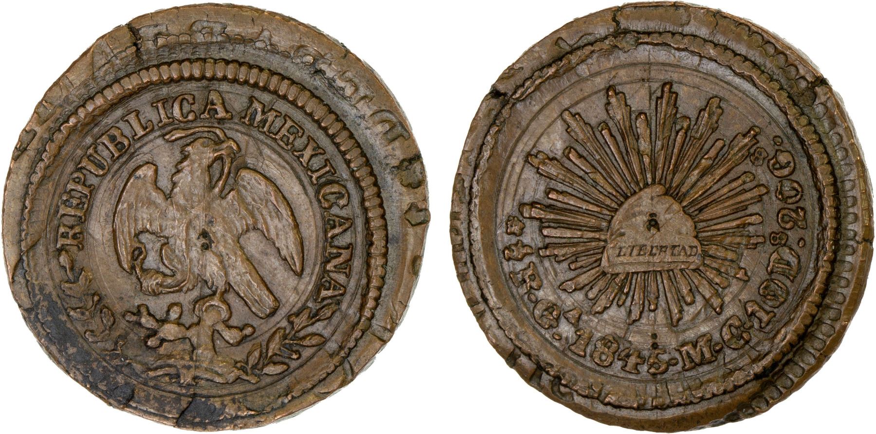 MEXICO: Republic, AE 1/2 real, 1845-Ga, KM-370.5, assayer MC, possible trial strike in copper, overstrike on brockage of the same, very unusual and interesting study piece, XF, ex Gordon Andreas Singer. Please note that this type is likely ineligible for submission with the grading companies.