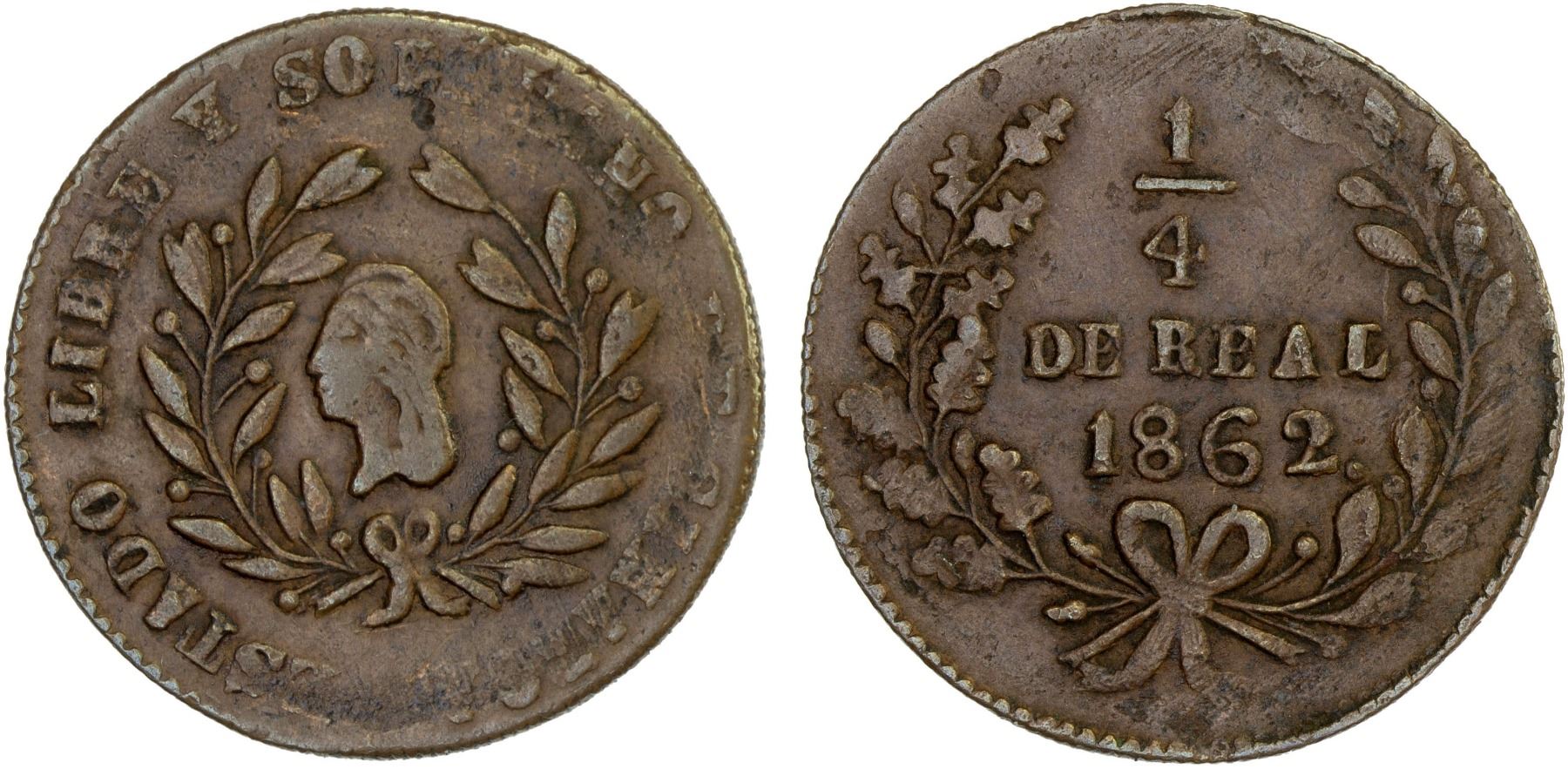 MEXICO: Republic, AE 1/4 real (quartilla), 1862, KM-363, Free and Sovereign State of Sinaloa type, VF.